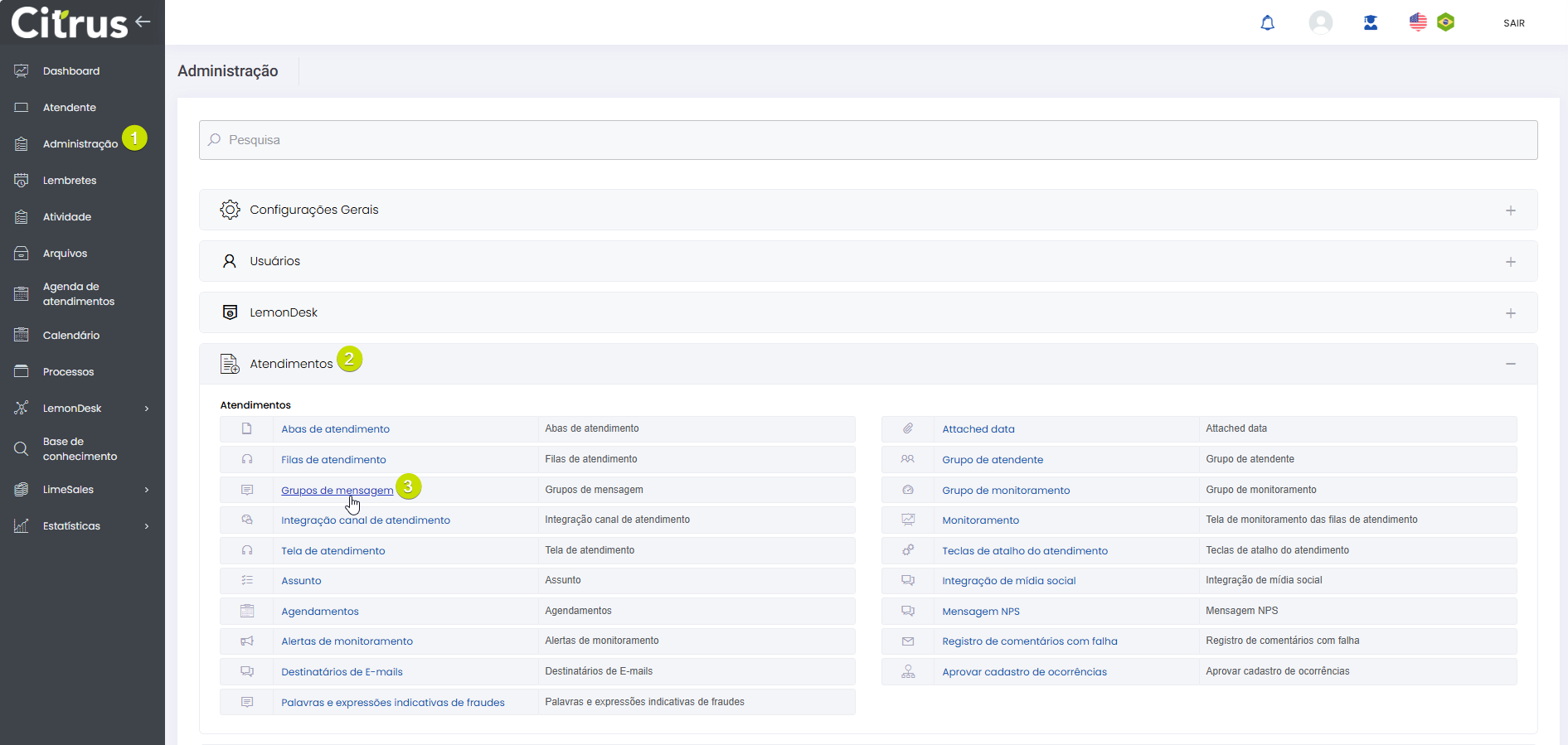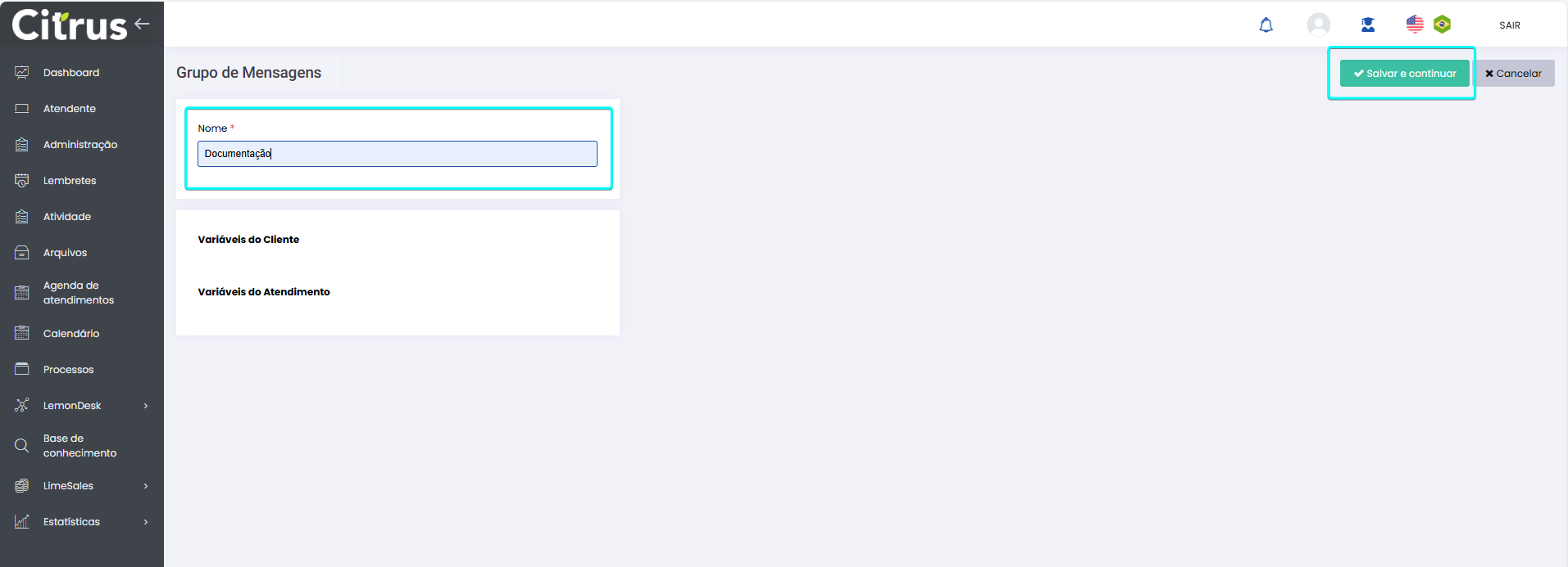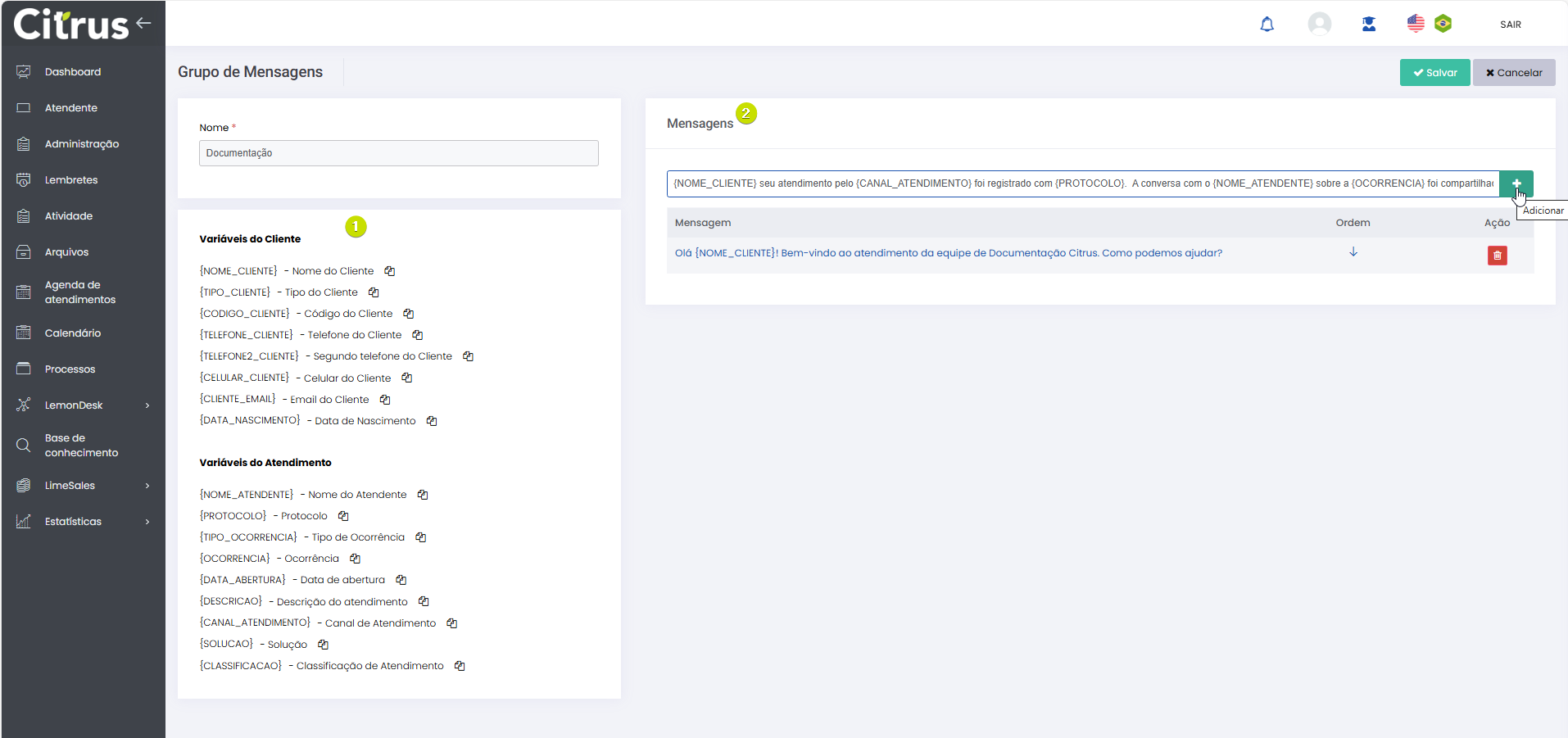 Tags rápidas para Grupos de mensagem WhatsApp e WebChat Leitura estimada: 4 minutos 252visualizações As “tags rápidas” permitem personalizar templates de mensagens que serão utilizadas em atendimentos dos canais de chat: WhatsApp e WebChat. Funcionam como atalhos inteligentes, disponíveis pelo menu Administração > Atendimentos > Grupos de mensagem > +Novo/Editar. Elas garantem a inclusão de variáveis (tags), como nome do cliente, número do Protocolo do atendimento, nome do Atendente, canal de atendimento, entre outras, em mensagens prontas (templates). O recurso evita a necessidade de inserir manualmente informações do cliente e do atendimento nas mensagens, porque utiliza dados disponíveis no sistema. A partir dele, a criação de templates torna-se mais ágil, facilitando a comunicação entre Atendentes e clientes. Quando templates de mensagens são enviados por formulários de atendimentos de WhatsApp e WebChat, o sistema substitui as variáveis por informações reais dos respectivos atendimentos. Principais Benefícios Agilidade no atendimento: Menos tempo digitando, mais tempo atendendo. Padronização: Garante que todos os Atendentes usem mensagens consistentes e alinhadas com a comunicação da empresa. Personalização automática: Cada cliente recebe mensagens adaptadas às suas informações, tornando a experiência mais próxima e eficiente. Redução de erros: Diminui as chances de digitação incorreta de dados de clientes ou de Protocolos de atendimentos. Variáveis Disponíveis Variáveis do Cliente {NOME_CLIENTE} – Nome completo do Cliente {PRIMEIRO_NOME_CLIENTE} Primeiro Nome Cliente {TIPO_CLIENTE} – Tipo do Cliente {CODIGO_CLIENTE} – Código do Cliente {TELEFONE_CLIENTE} – Telefone do Cliente {TELEFONE2_CLIENTE} – Segundo telefone do Cliente {CELULAR_CLIENTE} – Celular do Cliente {CLIENTE_EMAIL} – E-mail do Cliente {DATA_NASCIMENTO} – Data de Nascimento Variáveis do Atendimento {NOME_ATENDENTE} – Nome do Atendente {PROTOCOLO} – Protocolo {TIPO_OCORRENCIA} – Tipo de Ocorrência {OCORRENCIA} – Ocorrência {DATA_ABERTURA} – Data de abertura {DESCRICAO} – Descrição do atendimento {CANAL_ATENDIMENTO} – Canal de Atendimento {SOLUCAO} – Solução {CLASSIFICACAO} – Classificação de Atendimento Incluir tags rápidas em templates de mensagem Acesse o menu Administração > Atendimentos > Grupos de mensagem. Clique em +Novo, no topo direito da tela, para criar um Grupo de mensagens. Ou, pressione o nome de um grupo existente para editá-lo. Criar Grupo de mensagens: Dê um nome para o grupo e pressione Salvar e continuar (topo direito da tela). Observe que até o grupo ser criado nenhuma variável (tag) é exibida. Após salvar o Grupo de mensagens a tela será aberta exibindo dois blocos. O primeiro listará as “tags rápidas”: Variáveis do Cliente e Variáveis do Atendimento. O segundo permite criar mensagens utilizando as variáveis, adicioná-las ao Grupo de mensagens, e listá-las. Para criar uma mensagem basta clicar no botão Copiar ao lado da variável desejada no primeiro bloco. A seguir, colar no conteúdo da mensagem que está sendo digitada no campo para Adicionar (segundo bloco). Confira a demostração a seguir: É possível redefinir a ordem em que as mensagens são apresentadas na lista e Excluir mensagens pressionando o ícone de lixeira. Após criar e Adicionar mensagens é necessário clicar em Salvar, no topo da tela, para que sejam registradas e exibidas nos formulários de atendimento dos canais WhatsApp e WebChat. Utilizar templates de mensagens nos atendimentos Os templates de mensagem criados serão exibidos em formulários de atendimentos dos canais WhatsApp e WebChat no topo do campo “Comentário”. Para utilizá-los como comentário em atendimentos, basta seguir o passo a passo demonstrado nas imagens: Clique sobre a galeria para ver as imagens em tela cheia. Consulte a Release notes da versão 2.109.35 Acesse o Guia de Atendimento dos canais WhatsApp e WebChat × Clique nas imagens para vê-las em tela cheia. Se preferir, recolha o menu da lateral esquerda da página para uma melhor visualização de imagens e vídeo. Marcado:Atendimento WebChatAtendimento WhatsAppAutomação de Mensagens WhatsAppComentário com Resposta RápidaComentário com Variáveis de AtendimentoComentário com Variáveis de ClientesComentário de AtendimentoComentário de Atendimento WebChatComentário de Atendimento WhatsAppComentários Atendimento WhatsAppComentários com Dados de ClientesComentários com Informações de AtendimentosComentários com Informações de ClientesComentários com Variáveis de AtendimentoComentários com Variáveis de ClienteGrupo de MensagemGrupos de MensagemGrupos de Mensagem CitrusGuia de Administração CitrusMensagem WebChatMensagem WhatsAppMensagens Atendimentos Canais de ChatMensagens com Dados de AtendimentosMensagens com Dados de ClientesMensagens de AtendimentosMensagens PadrãoMensgem com Tag RápidaModelos de Mensagem WebChatModelos de Mensagens WebChatModelos de Mensagens WhatsAppTags para Templates Canais de AtendimentoTags RápidasTags Rápidas para Templates de MensagemTags Rápidas para Templates de MensagensTags Rápidas WhatsAppTemplate de Mensagem WebChatTemplate de Mensagem WhatsAppTemplates de MensagemTemplates de MensagensTemplates de Mensagens WebChatTemplates de Mensagens WhatsAppVariáveis de AtendimentoVariáveis de Cliente