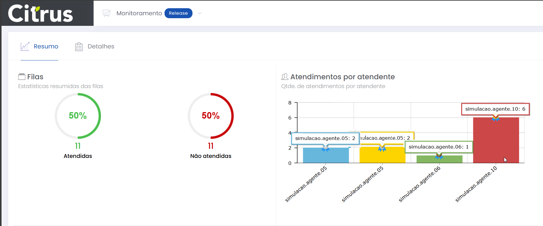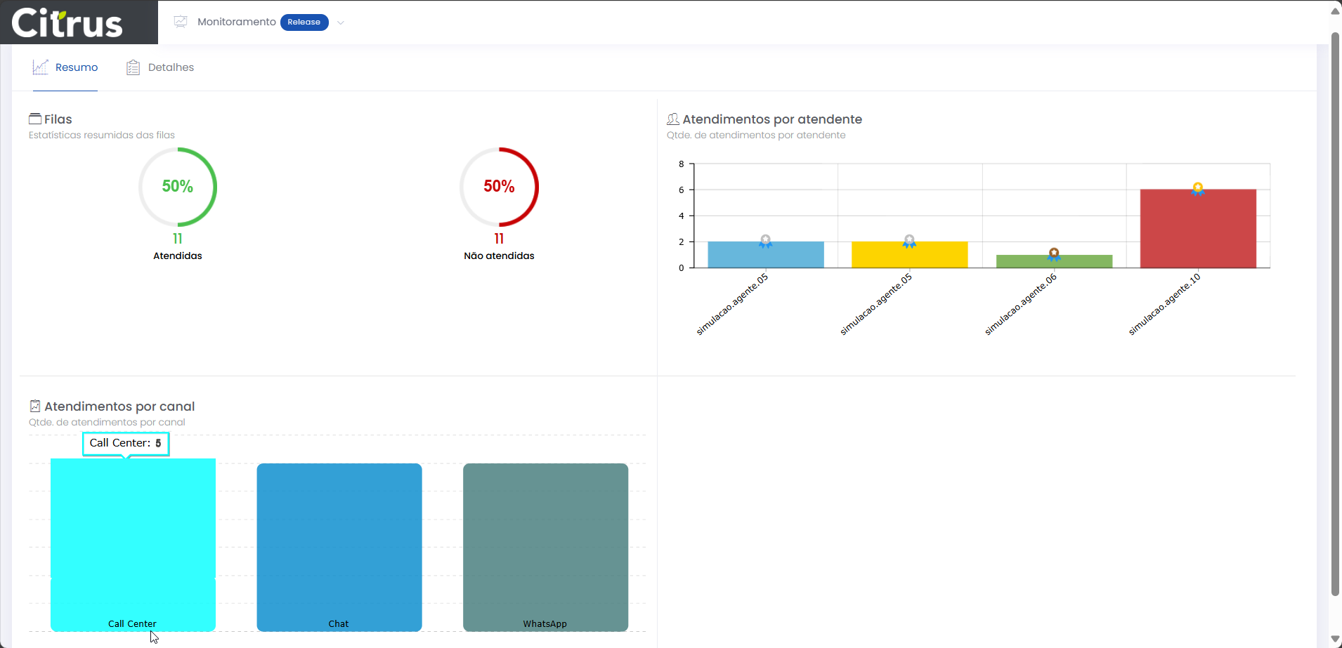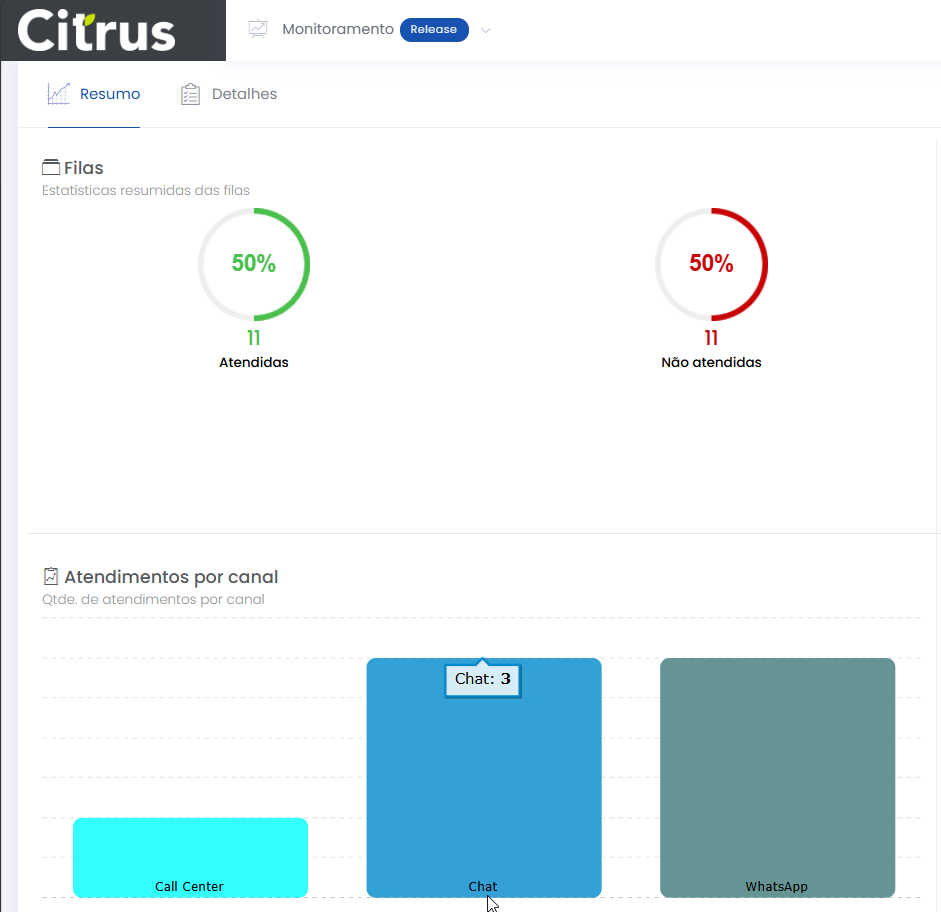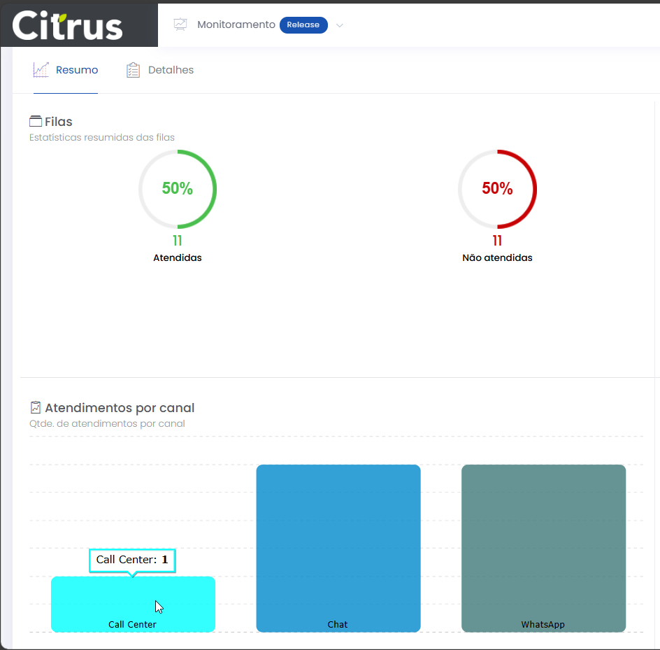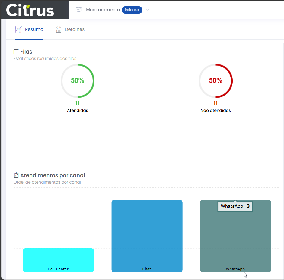 Resumo dos atendimentos Leitura estimada: 7 minutos 430visualizações A aba Resumo permite que o Supervisor acompanhe, em tempo real, uma visão geral dos atendimentos do dia, distribuídos por Filas, Canais e Atendentes. Os painéis da tela exibem indicadores para análise rápida do desempenho da operação. A partir das estatísticas apresentadas é possível aplicar ações imediatas para garantir eficiência no atendimento e uma boa experiência ao cliente. A observação da performance de atendimento, através dos gráficos da tela, ajuda a identificar situações que precisam ser analisadas com mais cuidado pela aba Detalhes. Visão geral da aba Resumo da tela de Monitoramento. Filas O painel de Filas mostra a quantidade e o percentual de atendimentos realizados e de atendimentos que deixaram de ser feitos, considerando todas as filas dos canais configurados no Grupo de monitoramento. Se, por exemplo, o grupo possuir apenas os canais de Voz e WhatsAp, os dados carregados na tela serão correspondentes às filas de atendimento associadas a eles. Estatísticas resumidas das filas de atendimento (considerando todas as filas dos canais configurados no Grupo de monitoramento). Regras de contabilização de “Atendidas” e “Não atendidas” Atendidas Finalizado pelo cliente (terminated_client): O atendimento é realizado (Atendente e cliente conversam em uma ligação ou por um canal de chat). Quando tem sua demanda resolvida, o cliente desliga a chamada (ligação cai) ou fecha o chat, e o atendimento é finalizado. Ou, o cliente desliga a chamada ou fecha a tela de chat antes do atendimento ser finalizado. Atendido (answered): O Atendente aceitou a chamada de Voz ou o card de chat (WebChat, WhatsApp). Finalizado pelo Atendente (terminated_agent): Quando o Atendente clica em Fechar atendimento ou termina a interação com o cliente e pressiona a ação “Finalizar“, no formulário do atendimento (tela de Atendimentos). Abandonado pelo Atendente (abandoned_agent): Quando o Atendente está com um card em atendimento e desloga da fila (Voz, WebChat ou de WhatsApp) ou da plataforma Citrus. Não atendidas Abandonado pelo cliente (abandoned_client): Exemplo: Para os canais de chat (WebChat e WhatsApp) ou Voz, o cliente desiste na fila ou enquanto o card está sendo ofertado para um Atendente. Tempo Limite de Sessão (session_timeout): Indica que o tempo de sessão, que é configurado na fila, expirou. O tempo de sessão pode expirar por inativadade do cliente. Exemplo: Cliente não responde as mensagens enviadas pelo Atendente durante o atendimento no canal WebChat, WhatsApp. O tempo limite de sessão é atingido e o atendimento é desconectado sem ser salvo pelo Atendente. Sem Atendente logado (no_agent_timeout): Exemplo: Quando o card é ofertado e não existe nenhum Atendente logado nas filas de Voz, WebChat ou de WhatsApp (fila em que o atendimento esta tocando). Atendimentos por canal O gráfico de colunas identifica a quantidade de atendimentos realizados em cada canal do Grupo de monitoramento. São constabilizados para o Monitoramento somente aqueles que foram salvos pelos Atendentes na tela de Atendimento. Ou seja, os atendimentos registrados na plataforma Citrus. A observação de diferenças entre as quantidades de atendimentos deste painel com o de Filas pode ser um indicativo para o Supervisor de que os Atendentes não estão salvando todos os atendimentos. Quantidade. de atendimentos por canal. Observe nas próximas imagens a demonstração da diferença encontrada ao comparar os gráficos de Filas e de Atendimentos por canal, de um Grupo de monitoramento em que Atendentes deixaram de salvar atendimentos. Note que enquanto o gráfico de Filas registra 11 atendimentos realizados, o de Atendimentos por canal contabiliza 1 do canal de Voz, 3 de WebChat e 3 de WhatsApp. A soma representa 7 atendimentos. Significa que, provavelmente, 4 atendimentos foram finalizados sem serem salvos na plataforma Citrus. Comparação entre os indicadores dos painéis de Filas e de Atendimentos por canal. Deixando de Salvar atendimento As próximas imagens demonstram um atendimento finalizado pelo Atendente, sem salvar na plataforma. Note que a tela de Atendimento exibe um alerta e solicita que o Atendente confirme se realmente deseja encerrar o atendimento sem salvar. O aviso é mostrado independentemente do tipo de atendimento (canal). Quando o Atendente tenta Fechar atendimento sem salvar, um alerta pede que confirme a ação. Ao clicar em Sim e Finalizar, esse atendimento não será contabilizado no Monitoramento. Atendimentos por atendente Este painel apresenta um gráfico de barras com a distribuição dos atendimentos realizados por Atendente. Cores e a identificação do login proporcionam uma visão individualizada. O total mostrado para cada Atendente corresponde às filas de todos os canais nos quais está vinculado para atender. As métricas também podem ser comparadas com os dados do painel de Filas. Quantidade de atendimentos por atendente. Na imagem de demonstração a seguir é possível confirmar que a soma dos atendimentos de cada Atendente é igual ao número de atendimentos realizados registados pela painel de Filas. Comparação de Atendimentos por atendente com painel de Filas. Não é recomendada a comparação dos dados dos painéis de Monitoramento do Citrus com os Relatórios de Contact Center da plataforma Smartspace Manager. Os dados gerados na plataforma Citrus têm regras de salvamento específicas. Por isso, existem diferenças na contabilização de atendimentos. Caso necessário, é possível criar um relatório na plataforma Citrus, de forma que os quantitativos fiquem iguais, utilizando as mesmas regras aplicadas na Smartspace Manager. Consulte o Guia Detalhes dos atendimentos Confira Status do Monitoramento Veja como funcionam os Alertas de Monitoramento Acesse Regras para Oferta de Cards de Atendimentos × Clique nas imagens desta página para vê-las em