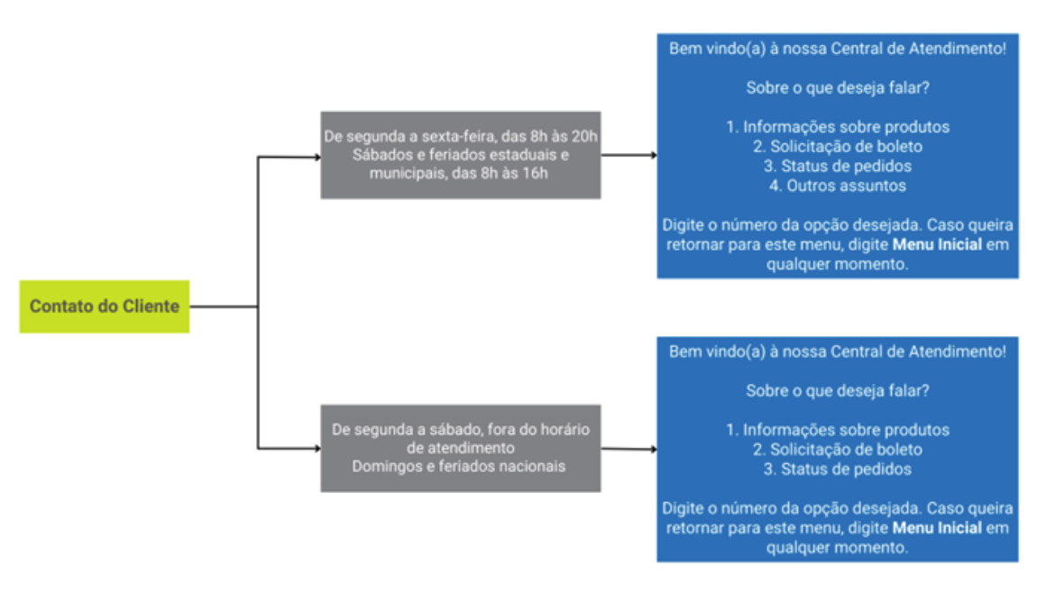 Canais de Atendimento Atendimento com Bot Estimated reading: 3 minutes 477 views Árvore do Bot No caso de atendimentos iniciados pelo chatbot, antes de serem transferidos para Atendentes humanos, são as árvores do bot que determinarão o fluxo a ser seguido. Exemplo: Abaixo é possível observar dois possíveis fluxos a serem adotados: um a ser seguido para os chamados realizados dentro dos horários de atendimento e outro para os chamados feitos fora dos horários estipulados. Histórico de navegação do chatbot antes do atendimento chegar ao Atendente Nos Atendimentos recebidos pelos canais de WhatsApp e WebChat, quando o cliente interage com o chatbot antes de ser transferido para um Atendente, as interações já realizadas poderão ser visualizadas por esse Atendente humano para que ele possa dar continuidade ao atendimento previamente iniciado.Assim, logo após aceitar um atendimento recebido via WhatsApp, o Atendente poderá visualizar toda a troca de mensagens ocorrida entre o cliente final e o bot. Dentro do Protocolo do atendimento (menu LemonDesk > Atendimentos > (selecionar) Protocolo), na aba “Histórico do atendimento”, ficam registradas todas as mensagens trocadas entre chatbot, Atendente e cliente. Além das mensagens trocadas entre o cliente e o bot, o Atendente poderá visualizar o canal de origem do atendimento, datas e horários de início e fim do atendimento, seu tempo de duração e eventuais observações que tenham sido registradas. Grupos de mensagens Grupos de mensagens são scripts curtos que um Atendente pode enviar para um contato em atendimento. Nesses grupos, estão mensagens que o Atendente utiliza frequentemente no dia a dia, em sua rotina de atendimentos. Com esse recurso, é possível agrupar sugestões de mensagens por temas ou categorias específicas, como, por exemplo, saudações (“Bom dia, em que posso ajudar?“) e mensagens de término do atendimento (“Agradecemos pelo contato, tenha um bom dia!“). O intuito do Grupo de mensagens é evitar que o Atendente precise digitar essas mensagens antes de enviá-las para um contato. Com isso, o atendente precisará apenas de um clique para enviar uma mensagem já cadastrada para um contato em atendimento, sem a necessidade de digitá-la. Além de agilizar a comunicação com o cliente, essa funcionalidade contribui para a padronização e manutenção da qualidade do atendimento. Dica: Os Grupos de mensagens poderão ser criados por um usuário com perfil de Administrador pelo menu Administração > Atendimentos > Grupos de mensagem.