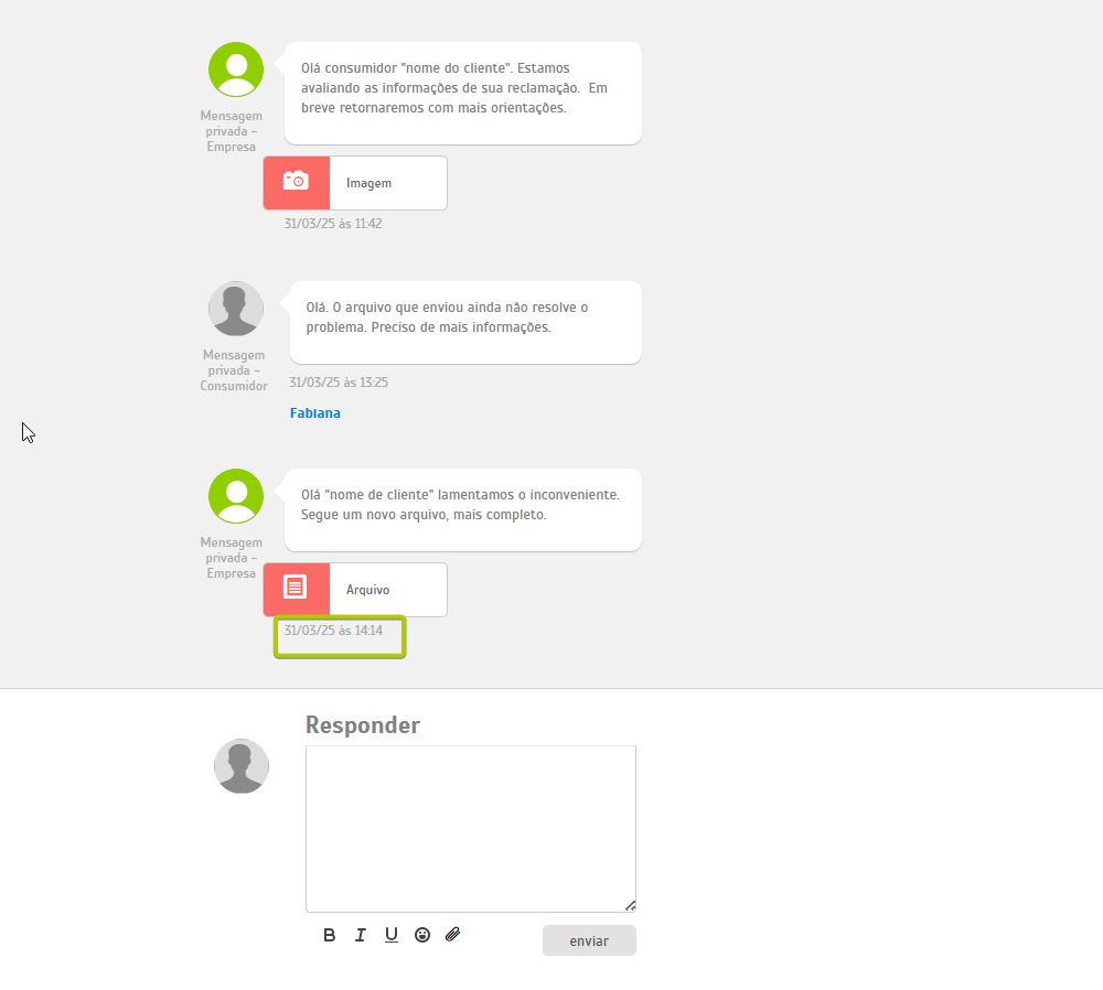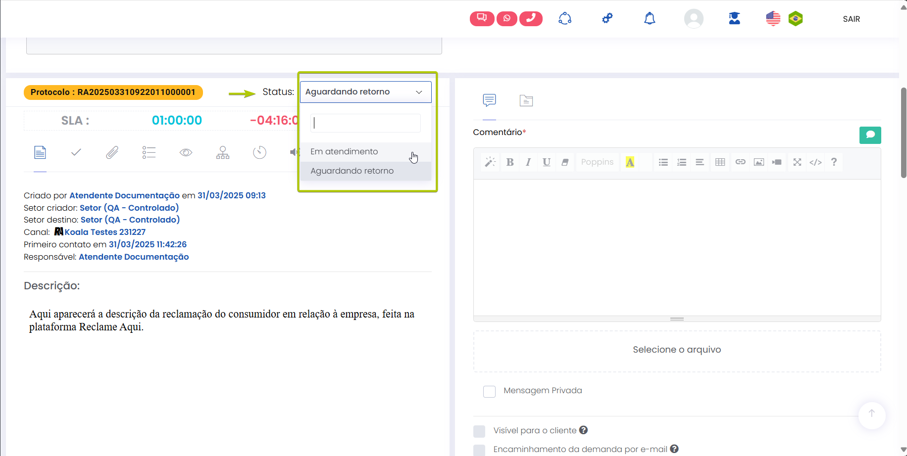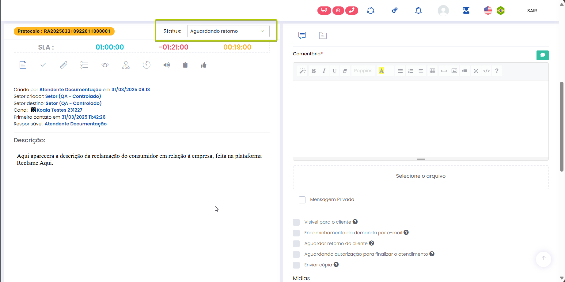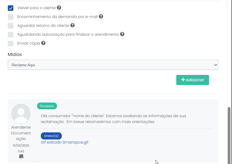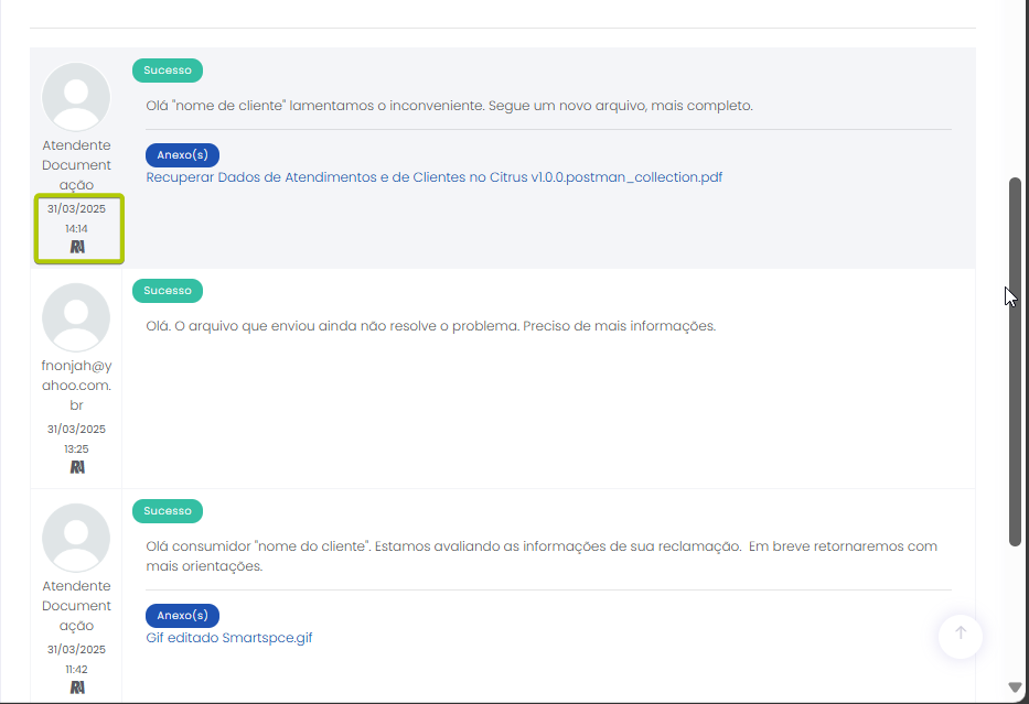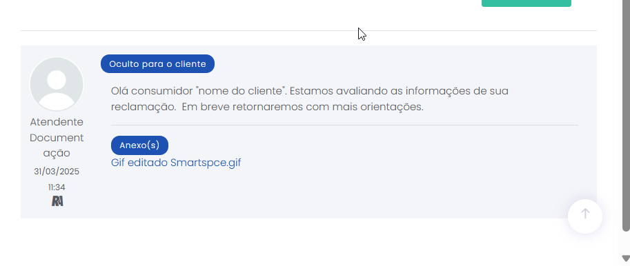 Atender pelo canal Reclame Aqui Leitura estimada: 4 minutos 314visualizações Confira a Tabela de Versionamento Na seção Comentários escreva o conteúdo da resposta que será enviada para o consumidor visualizar na plataforma Reclame Aqui. Anexos: Se desejar inserir anexo(s) pressione o botão Selecione o arquivo. É possível adicionar anexo(s) até 3 MB. *Caso o(s) arquivo(s) ultrapasse(m) o limite, um alerta será exibido na tela, lembrando a regra. IMPORTANTE IMPORTANTE: Respostas que contenham anexo(s) não ficarão públicas no Reclame Aqui, sendo exibidas de forma privada apenas para o consumidor que registrou a reclamação e está sendo respondido. Ao inserir um anexo, a opção “Mensagem Privada” (abaixo do campo de comentário) será automaticamente habilitada, e a tela exibirá o alerta “Respostas com anexos são visíveis apenas em respostas privadas.” A opção não poderá ser desabilitada, a menos que o(s) anexo(s) sejam removidos antes de adicionar a resposta.. “Visível para o cliente”: Marque a caixa de seleção da opção se desejar que o comentário seja publicado na plataforma Reclame Aqui para o consumidor, no histórico da reclamação. Um pop-up questionará se quer realmente enviar o comentário para o cliente. Confirme clicando em “Sim”. Ao fazer isso, o comentário aparecerá no histórico de atendimento como “Sucesso” e o consumidor o verá no histórico da reclamação no Reclame Aqui. A resposta será exibida no Reclame Aqui de acordo com o “Intervalo de sincronia” configurado na Integração do canal . Quando a opção “Visível para o cliente” não for habilitada, o comentário ficará registrado apenas no histórico do atendimento no Citrus como “Oculto para o cliente”. O comentário “Oculto para o cliente” não pode ser revertido em “Visível para o cliente”, sendo necessário criar outro comentário e marcar a opção para ficar visível. Aguardando retorno: Assim que o primeiro comentário de resposta da empresa for adicionado ao atendimento como “Visível para o cliente” o status do atendimento no Citrus será atualizado para “Aguardando retorno”. IMPORTANTE IMPORTANTE: Se o Atendente inserir novos comentários em um atendimento com status “Aguardando retorno” no Citrus, as novas mensagens serão incorporadas ao atendimento e o status do card no Citrus será atualizado para “Em atendimento”. Consulte Perguntas Frequentes. Encaminhamento da demanda por e-mail: O Atendente poderá habilitar essa opção para esclarecer dúvidas com outras áreas da empresa antes de responder o cliente. Ao marcar a caixa de seleção, um bloco de Lembrete será exibido, exigindo que o Atendente selecione em quanto “Tempo” o sistema deve emitir um lembrete sobre este comentário (em minutos, horas ou dias), e o “Motivo”. As mensagens podem conter texto e anexo e todas ficarão registradas nos Comentários do atendimento como histórico, identificando Remetente e Destinatário. O funcionamento do recurso respeitará os seguintes critérios: • O e-mail pode ser encaminhado para um ou para múltiplos destinatários. • O(s) endereço(s) de e-mail que devem receber a mensagem podem ser preenchidos manualmente ou pela busca na lista de Destinatários de E-mails. • As respostas recebidas para um e-mail ficarão agrupadas junto dele nos comentários do atendimento e identificarão Remetente e Destinatário. • O Atendente pode enviar quantos e-mails forem necessários, com assuntos diferentes, para áreas distintas da empresa. • O lembrete não altera o status do atendimento. • O lembrete chegará para o Atendente por e-mail. Além disso, ficará visível pelo ícone de sino no topo da tela ao abrir o atendimento, após o tempo que foi definido para ser exibido. Desaparecerá do “sino” quando o Atendente clicar em Abrir atendimento na notificação. Só então aparecerá nos comentários do atendimento. • Se o Atendente marcar a opção “Visível para o cliente”, a resposta seguirá também para o cliente no Reclame Aqui. • Respostas para e-mails recebidas após o atendimento ter sido “Finalizado” serão registradas no histórico de comentários, sem alterar o status do atendimento. Encaminhamento da demanda por e-mail” Essa demonstração é meramente explicativa. . Aguardar retorno do cliente: Quando habilitada permite que o Atendente configure um Lembrete para ser notificado quando o cliente der algum retorno para a resposta enviada para ele no Reclame Aqui, pelo atendimento. *Caso o status do atendimento seja “Em atendimento”, ao marcar a opção o status será atualizado para “Aguardando retorno”, pois ao habilitá-la, automaticamente o sistema ativará a opção “Visível para o cliente” e enviará uma resposta para o consumidor no Reclame Aqui. O lembrete será exibido pelo ícone de sino no topo da tela de Atendimentos. O Atendente pode clicar para abrir /atualizar o atendimento relacionado com o novo comentário, ou, pressionar “Marcar como visualizado”. Atualização de status: Observe que ao receber um novo comentário do cliente (réplica), o status do atendimento é atualizado de “Aguardando retorno” para “Em atendimento”. Esse fluxo se repetirá toda vez que o Atendente (pelo Citrus) ou o cliente (pelo Reclame Aqui) replicarem respostas para comentários recebidos. As mensagens aparecerão salvas no histórico do atendimento no Citrus e na reclamação no Reclame Aqui. < Histórico do atendimento no Citrus. Histórico do atendimento no Reclame Aqui. IMPORTANTE IMPORTANTE: As mensagens de Atendentes são enviadas ao Reclame Aqui em tempo real. Por isso, nas imagens acima é possível ver que o horário de registro do comentário do Atendente no Citrus é o mesmo no histórico da reclamação no Reclame Aqui. Assim como os horários dos comentários do cliente. Ou seja, os dados entre as plataformas são sincronizados e atualizados no “intervalo