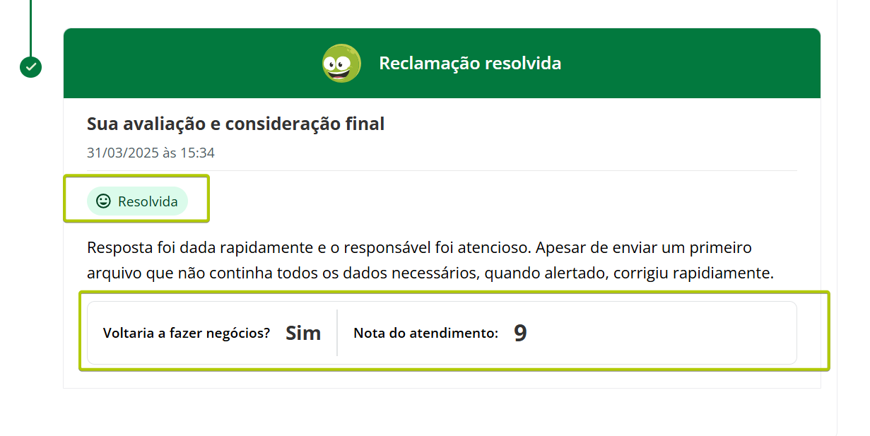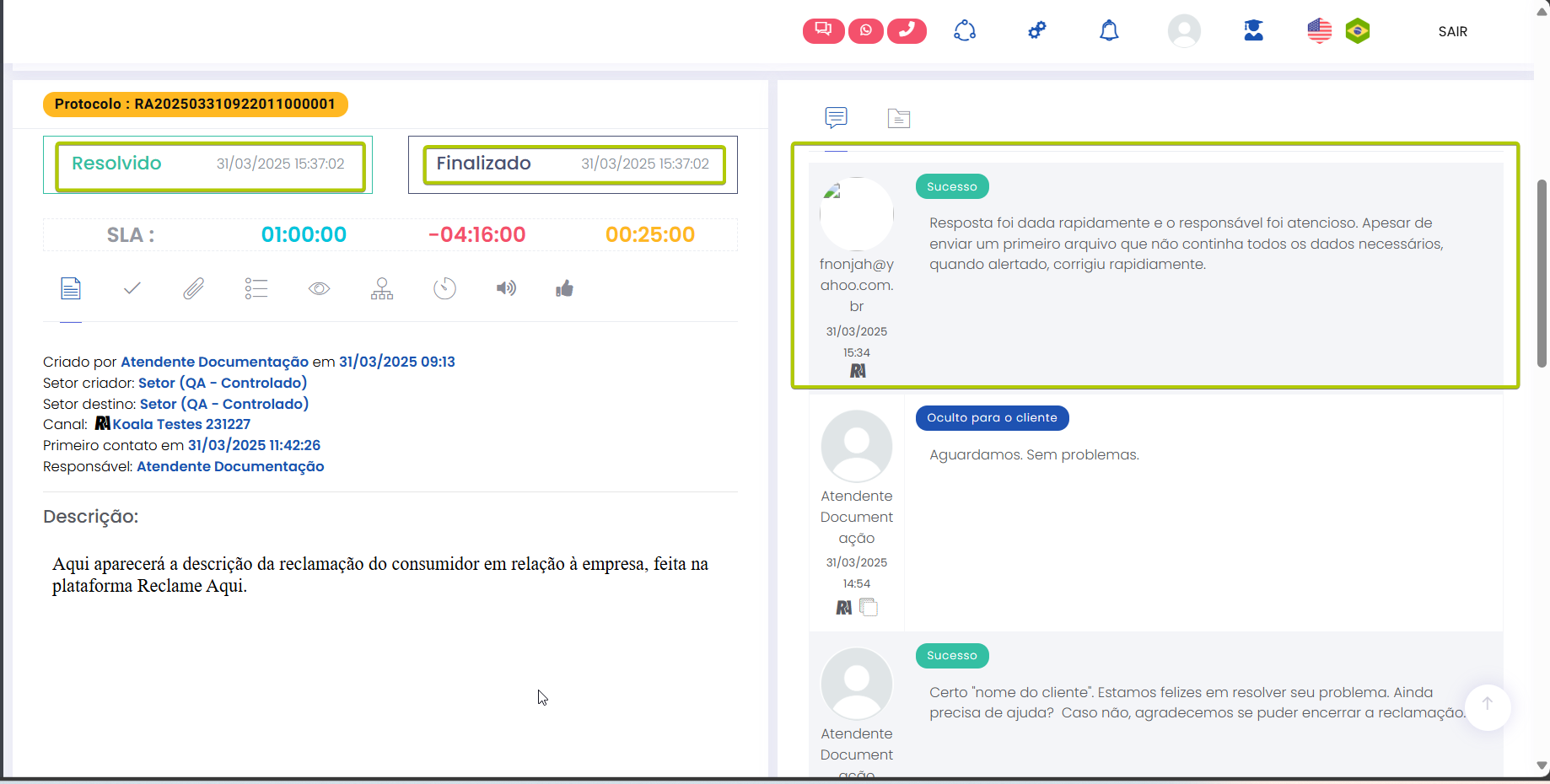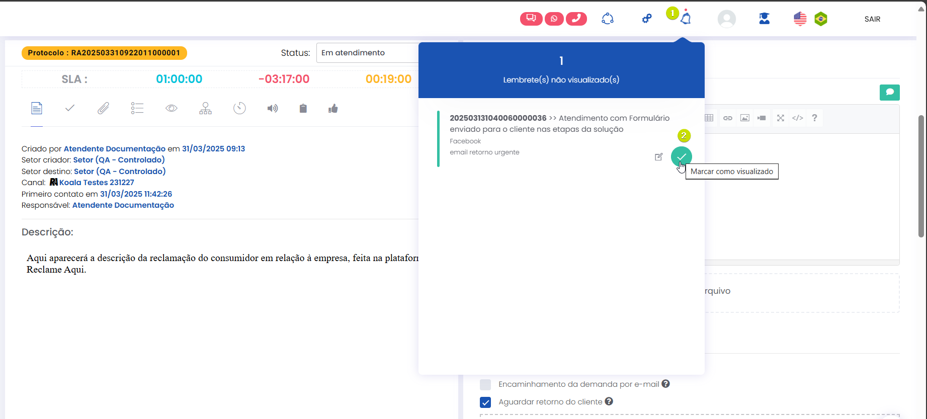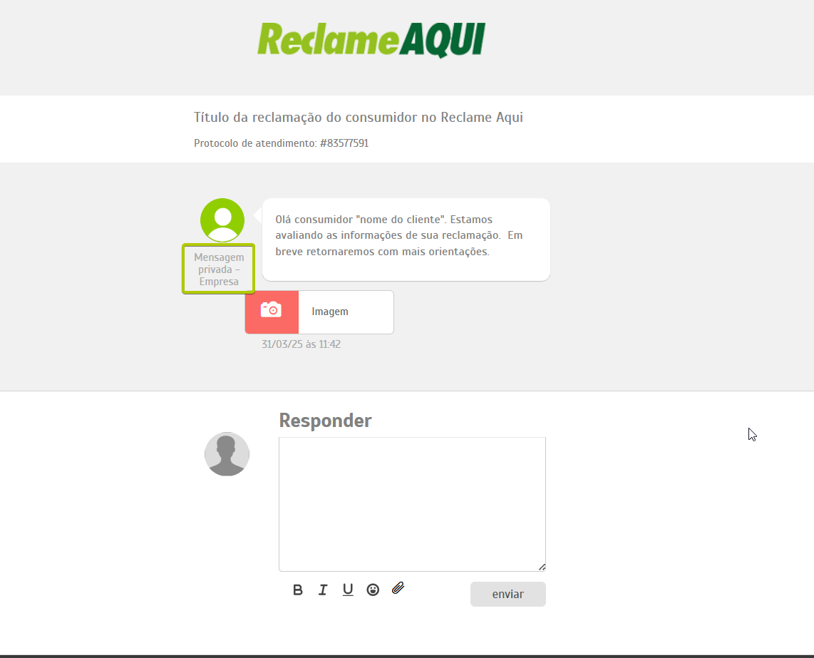 Atender pelo canal Reclame Aqui Leitura estimada: 4 minutos 314visualizações Confira a Tabela de Versionamento Na seção Comentários escreva o conteúdo da resposta que será enviada para o consumidor visualizar na plataforma Reclame Aqui. Anexos: Se desejar inserir anexo(s) pressione o botão Selecione o arquivo. É possível adicionar anexo(s) até 3 MB. *Caso o(s) arquivo(s) ultrapasse(m) o limite, um alerta será exibido na tela, lembrando a regra. IMPORTANTE IMPORTANTE: Respostas que contenham anexo(s) não ficarão públicas no Reclame Aqui, sendo exibidas de forma privada apenas para o consumidor que registrou a reclamação e está sendo respondido. Ao inserir um anexo, a opção “Mensagem Privada” (abaixo do campo de comentário) será automaticamente habilitada, e a tela exibirá o alerta “Respostas com anexos são visíveis apenas em respostas privadas.” A opção não poderá ser desabilitada, a menos que o(s) anexo(s) sejam removidos antes de adicionar a resposta.. “Visível para o cliente”: Marque a caixa de seleção da opção se desejar que o comentário seja publicado na plataforma Reclame Aqui para o consumidor, no histórico da reclamação. Um pop-up questionará se quer realmente enviar o comentário para o cliente. Confirme clicando em “Sim”. Ao fazer isso, o comentário aparecerá no histórico de atendimento como “Sucesso” e o consumidor o verá no histórico da reclamação no Reclame Aqui. A resposta será exibida no Reclame Aqui de acordo com o “Intervalo de sincronia” configurado na Integração do canal . Quando a opção “Visível para o cliente” não for habilitada, o comentário ficará registrado apenas no histórico do atendimento no Citrus como “Oculto para o cliente”. O comentário “Oculto para o cliente” não pode ser revertido em “Visível para o cliente”, sendo necessário criar outro comentário e marcar a opção para ficar visível. Aguardando retorno: Assim que o primeiro comentário de resposta da empresa for adicionado ao atendimento como “Visível para o cliente” o status do atendimento no Citrus será atualizado para “Aguardando retorno”. IMPORTANTE IMPORTANTE: Se o Atendente inserir novos comentários em um atendimento com status “Aguardando retorno” no Citrus, as novas mensagens serão incorporadas ao atendimento e o status do card no Citrus será atualizado para “Em atendimento”. Consulte Perguntas Frequentes. Encaminhamento da demanda por e-mail: O Atendente poderá habilitar essa opção para esclarecer dúvidas com outras áreas da empresa antes de responder o cliente. Ao marcar a caixa de seleção, um bloco de Lembrete será exibido, exigindo que o Atendente selecione em quanto “Tempo” o sistema deve emitir um lembrete sobre este comentário (em minutos, horas ou dias), e o “Motivo”. As mensagens podem conter texto e anexo e todas ficarão registradas nos Comentários do atendimento como histórico, identificando Remetente e Destinatário. O funcionamento do recurso respeitará os seguintes critérios: • O e-mail pode ser encaminhado para um ou para múltiplos destinatários. • O(s) endereço(s) de e-mail que devem receber a mensagem podem ser preenchidos manualmente ou pela busca na lista de Destinatários de E-mails. • As respostas recebidas para um e-mail ficarão agrupadas junto dele nos comentários do atendimento e identificarão Remetente e Destinatário. • O Atendente pode enviar quantos e-mails forem necessários, com assuntos diferentes, para áreas distintas da empresa. • O lembrete não altera o status do atendimento. • O lembrete chegará para o Atendente por e-mail. Além disso, ficará visível pelo ícone de sino no topo da tela ao abrir o atendimento, após o tempo que foi definido para ser exibido. Desaparecerá do “sino” quando o Atendente clicar em Abrir atendimento na notificação. Só então aparecerá nos comentários do atendimento. • Se o Atendente marcar a opção “Visível para o cliente”, a resposta seguirá também para o cliente no Reclame Aqui. • Respostas para e-mails recebidas após o atendimento ter sido “Finalizado” serão registradas no histórico de comentários, sem alterar o status do atendimento. Encaminhamento da demanda por e-mail” Essa demonstração é meramente explicativa. . Aguardar retorno do cliente: Quando habilitada permite que o Atendente configure um Lembrete para ser notificado quando o cliente der algum retorno para a resposta enviada para ele no Reclame Aqui, pelo atendimento. *Caso o status do atendimento seja “Em atendimento”, ao marcar a opção o status será atualizado para “Aguardando retorno”, pois ao habilitá-la, automaticamente o sistema ativará a opção “Visível para o cliente” e enviará uma resposta para o consumidor no Reclame Aqui. O lembrete será exibido pelo ícone de sino no topo da tela de Atendimentos. O Atendente pode clicar para abrir /atualizar o atendimento relacionado com o novo comentário, ou, pressionar “Marcar como visualizado”. Atualização de status: Observe que ao receber um novo comentário do cliente (réplica), o status do atendimento é atualizado de “Aguardando retorno” para “Em atendimento”. Esse fluxo se repetirá toda vez que o Atendente (pelo Citrus) ou o cliente (pelo Reclame Aqui) replicarem respostas para comentários recebidos. As mensagens aparecerão salvas no histórico do atendimento no Citrus e na reclamação no Reclame Aqui. < Histórico do atendimento no Citrus. Histórico do atendimento no Reclame Aqui. IMPORTANTE IMPORTANTE: As mensagens de Atendentes são enviadas ao Reclame Aqui em tempo real. Por isso, nas imagens acima é possível ver que o horário de registro do comentário do Atendente no Citrus é o mesmo no histórico da reclamação no Reclame Aqui. Assim como os horários dos comentários do cliente. Ou seja, os dados entre as plataformas são sincronizados e atualizados no “intervalo