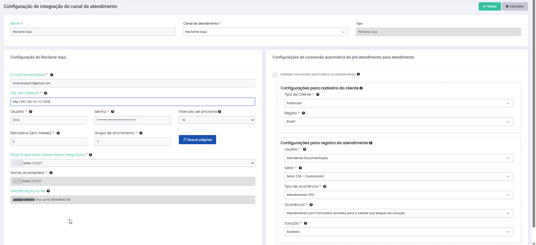 Configuração Leitura estimada: 5 minutos 293visualizações A configuração de integração do canal deve ser feita como descrito no passo a passo: O usuário com perfil Administrador deve acessar menu Administração > Atendimentos > Integração canal de atendimento > Configuração de integração do canal de atendimento e clicar no botão +Novo (topo direito da tela). *A tela de configuração será aberta para iniciar o cadastro. Informe os dados obrigatórios dos campos sinalizados com asterisco na cor vermelha: • Nome: Informe o nome que identificará a integração. *Não precisa necessariamente ser o nome da conta da empresa no Reclame Aqui. Este dado será solicitado nas próximas etapas do cadastro. • Canal de atendimento: Selecione Reclame Aqui. • Tipo (de atendimento): Selecione Reclame Aqui. *Observe que os demais campos que eram mostrados na tela não serão mais exibidos. Pressione Salvar e continuar (topo direito da tela). Siga para a seção Configuração do Reclame Aqui, preenchendo os campos: • E-mail da empresa: Mesmo e-mail de contato da empresa, cadastrado no Reclame Aqui. • URL de Callback: O sistema do Reclame Aqui enviará uma notificação automática para o URL de callback configurado quando qualquer informação ou atualização for registrada no Reclame Aqui. Esse URL aponta para o endpoint de uma API do Citrus, que recebe e processa esses dados para atualizar os atendimentos. • Usuário: Usuário de acesso. O mesmo utilizado na autenticação da API do Reclame Aqui. • Senha: A utilizada na autenticação da API do Reclame Aqui. • Intervalo de sincronia: A sincronização de dados de atendimentos no Citrus com informações do Reclame Aqui ocorrerá automaticamente no tempo configurado neste campo. É possível definir um intervalo entre 10 e 1.440 minutos (24 horas). IMPORTANTE IMPORTANTE: As respostas dos Atendentes serão enviadas ao Reclame Aqui em tempo real (de maneira síncrona). • Retroativo (em meses): Insira quantos meses no passado devem ter os atendimentos sincronizados entre Citrus e Reclame Aqui. O Citrus vai sincronizar e listar todos os atendimentos, de qualquer status (“Em atendimento”, “Aguardando retorno”, “Finalizado”) do período configurado no campo. IMPORTANTE IMPORTANTE: Se o valor preenchido no campo for zero (0) serão sincronizados apenas atendimentos do dia vigente, também de todos os status. • Grupo de sincronismo: Grupo prioritário durante a sincronia geral com o Reclame Aqui. • Buscar página: Clique no botão para que as páginas da empresa sejam buscadas e listadas no campo “Página que será usada nessa integração”. • Página que será usada nessa integração: Selecione a página da empresa no Reclame Aquique será usada na integração. • Nome da empresa: Nome da empresa proprietária da página no Reclame Aqui que está sendo integrada. • Identificação no RA: ID de identificação da empresa (cliente Citrus) no Reclame Aqui. Exemplo de configuração da seção Configuração do Reclame Aqui. Na seção de Configurações de conversão automática de pré-atendimento para atendimento o Administrador pode marcar, ou não, a opção “Habilitar conversão automática no atendimento”. Exemplo de Estilo com CSS Dica: Para o Reclame Aqui não ocorre geração de Pré-atendimentos. Então, é necessário habilitar e configurar a conversão automática de pré-atendimentos para atendimentos. . Nas Configurações para cadastro do cliente selecione: • Tipo de Cliente: Selecione o tipo de cliente que será exibido nos atendimentos do canal. * Os tipos de cliente são pré-configurados no Citrus para classificar e identificar clientes nos atendimentos. Por exemplo: Pessoa Física, Pessoa Jurídica, CPF, CNPJ, Particular. Acesse mais informações sobre Tipo de cliente • Região: Selecione a de localização do cliente. *As regiões também são pré-configuradas pelo Administrador. Nas Configurações para registro do atendimento selecione a opção deseja para: • Usuário: O usuário selecionado será associado como criador padrão para todos os atendimentos recebidos pelo canal. • Setor: Setor que ficará responsável pelos atendimentos do canal. • Tipo de Ocorrência: Os “Tipos de Ocorrência” são como os principais assuntos que os clientes buscam ao abrir solicitações e são vinculados aos Setores de atendimento da empresa. • Ocorrência: As ocorrências são temas específicos vinculados aos “Tipos de Ocorrência” cadastrados. Funcionam como subcategorias dentro dos “Tipos de Ocorrência” existentes. Confira como configurar “Tipos de Ocorrência e “Ocorrências”. • Solução: São as opções de resolução que poderão ser registradas nos atendimentos do canal, para encerrá-los (atendimento com status “Finalizado”). Consulte mais informações sobre Fluxos de Solução Após preencher o cadastro pressione Salvar no topo direito da tela. *O cadastro poderá ser Editado posteriormente, sempre que for necessário atualizar configurações. Colaborador Smartspace, faça login para mais informações! Login ▼ Login Exclusivo para colaborador Smartspace. Usuário: Senha: Entrar Acesse as APIs Reclame Aqui Resposta Pública Mensagem Privada Acesse o Guia de Integração Integração do Canal Reclame Aqui Fechar Release notes da versão 2.114.1 Consulte o Guia de Atendimento Confira as Perguntas Frequentes Acesse o Guia da API Cloud Ticket × Clique nas imagens desta página para vê-las em tela cheia. Se preferir, recolha o menu da lateral esquerda da página para uma melhor visualização de imagens e vídeos. Marcado:Canal Reclame AquiCitrus Canal Reclame AquiComo Configurar Reclame AquiComo Realizar Atendimento Reclame AquiConfigurar Integração com Reclame AquiDúvidas sobre Reclame AquiIntegração Citrus com Reclame AquiIntegração com Reclame AquiReclame AquiReclame Aqui CitrusResolver Reclamação no Reclame AquiResponder Con