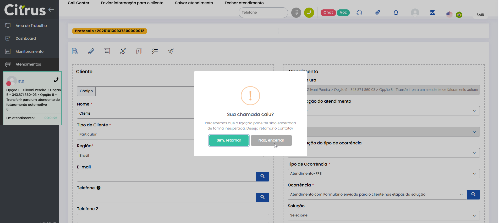 Atendimento em filas com Callback Leitura estimada: 5 minutos 284visualizações O recurso de Callback (chamada de retorno) pode ser utilizado em filas do Canal de Voz para evitar o encerramento prematuro de chamadas. Ou seja, que uma ligação termine de forma não intencional. Por exemplo: queda ou desligamento pelo cliente. Quando acontece interrupção inesperada de uma chamada em andamento, ao invés de encerrar automaticamente a ligação, o sistema exibe um pop-up de decisão para o Atendente escolher entre retomar o contato ou encerrar definitivamente. A opção do Atendente fica registrada no sistema para rastreabilidade. Principais Benefícios Evita a perda de atendimentos em andamento e reduz erros de encerramento prematuro. Controle sobre a continuidade de atendimentos, dando autonomia para o Atendente decidir retomar o atendimento. Manutenção de contexto (o atendimento retomado preserva o mesmo Protocolo). Registro da decisão do Atendente para auditoria. Pré-requisitos Para que o Callback funcione precisa ser previamente configurado nas filas de voz. Além de estar logado em fila receptiva (de entrada/inbound) para receber chamadas, o Atendente precisa estar logado em ao menos uma fila ativa (de saída, outbound), para que a chamada de retorno seja realizada. Colaborador Smartspace, consulte o Guia Sincronização de filas com Callback Ativo Realizar Atendimento com Callback O Callback inicia com a interrupção inesperada de uma chamada em andamento. Se o cliente desligar ou a chamada cair, o sistema detecta automaticamente. A partir desse momento o Atendente poderá proceder como descrito a seguir: Um pop-up é apresentado na tela de Atendimentos, exibindo o alerta: “Sua chamada caiu? Percebemos que a ligação pode ter sido encerrada de forma inesperada. Deseja retomar o contato?“ O Atendente pode clicar em “Sim, retomar” ou em “Não, encerrar“. IMPORTANTE IMPORTANTE Se o Atendente desligar a chamada manualmente, o pop-up não será exibido. Sim, retomar: Ao Atendente selecionar a opção de retomar o contato com o cliente, o sistema liga para o número do cliente. • Se o cliente aceitar a ligação de Callback, o atendimento será restabelecido com o mesmo número de Protocolo. • Se o cliente não aceitar a ligação de Callback, o Atendente poderá preencher as informações no formulário de atendimento (caso ainda não tenha feito) e Finalizar atendimento. Não, encerrar: Quando o Atendente clicar na opção para não fazer Callback, basta Finalizar atendimento, seguindo o procedimento padrão do sistema. O pop-up de decisão sobre Callback é exibido para o Atendente por 10 segundos. Caso nenhuma opção seja selecionada nesse tempo, o pop-up deixa de ser apresentado e, no topo do formulário do atendimento, aparecerá o botão Ligação de Callback (ícone de telefone na cor azul). O Atendente também poderá utilizá-lo para iniciar o Callback. *Mesmo que o timeout de 10 segundos do pop-up de alerta tenha expirado e o botão Ligação de Callback esteja aparecendo no topo do formulário, o Atendente ainda pode decidir não realizar o Callback. Basta selecionar o card de atendimento e executar a finalização padrão de encerramento do contato de voz. Transferência de Chamada: Se a interrupção inesperada do atendimento acontecer no processamento de transferência de chamada, Cega (Direta) ou Assistida (anunciando a transferência para o destinatário antes de concluir), a opção de retomar atendimento será mostrada para: • Atendente que iniciou a tentativa de transferência, caso a interrupção do contato aconteça antes da transferência ser concluída. • Atendente que aceitou a transferência, caso a ligação tenha sido interrompida depois do destinátário da transferência já ter aceito a chamada. Atendimento “Em espera“: O comportamento do Callback será mantido, com o pop-up de alerta exibido na tela por 10 segundos e, após encerrar o tempo, o botão Ligação de Callback (ícone de telefone na cor azul) aparecendo no topo do formulário de atendimento. Múltiplos cards em atendimento: Quando vários cards de voz estiverem em atendimento, basta o Atendente clicar naquele que teve a ligação interrompida e para o qual deseja realizar Callback. Consulte a Release notes da Versão 2.109.35 × Clique nas imagens para vê-las em tela cheia. Se preferir, recolha o menu da lateral esquerda da página para uma melhor visualização de imagens e vídeos. Marcado:Agente com CallbackAtendente com CallbackAtendimento Canal de Voz com CallbackAtendimento de Voz com CallbackAtendimento de Voz em Filas com CallbackAtendimento em Filas com CallbackAtrendimento de Voz com CallbackCall Center com CallbackCallback na Tela de AtendimentosCanal de Voz com CallbackComo fazer Chamada CallbackComo Fazer Ligação CallbackComo Retornar Chamada com ClienteContact Center com CallbackFilas de Voz com CallbackOperador com CallbackTela de Atendimentos com Callback