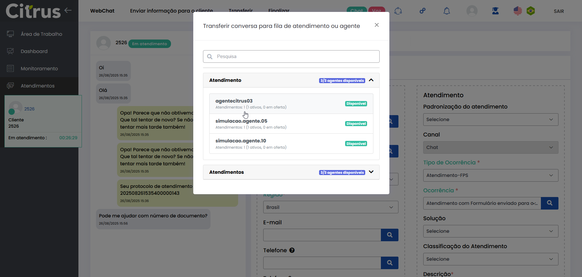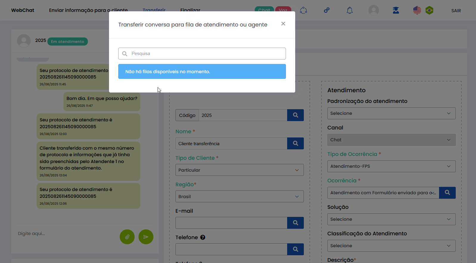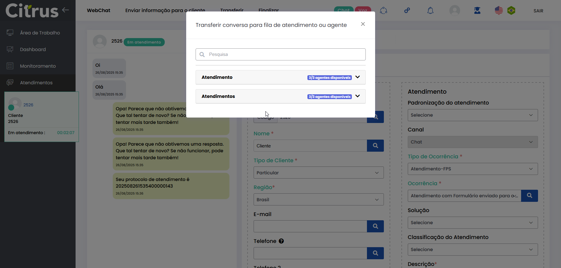 Transferir Atendimento WebChat Leitura estimada: 4 minutos 273visualizações O Atendente pode transferir atendimentos em andamento para outra fila ou outro Atendente do canal WebChat. A transferência permite que o cliente seja direcionado para o profissional ou setor mais adequado, sem perder o histórico da conversa. Além disso, o número do Protocolo é mantido após a transferência. O recurso proporciona fluidez aos atendimentos do canal e garante que todas as informações já fornecidas sejam preservadas. Benefícios O cliente não precisa repetir informações após a transferência. O novo Atendente tem acesso a todo o histórico da conversa. O atendimento segue com o mesmo número de Protocolo. Apenas Atendentes realmente disponíveis recebem a transferência. A experiência do cliente permanece fluida e transparente. Como a transferência funciona O atendimento permanece no canal: transferência só pode ser feita WebChat → WebChat. Campos obrigatórios do formulário de atendimento devem estar preenchidos antes da transferência. O atendimento transferido entra na fila de destino como prioridade 1, sendo o próximo a ser ofertado. O card é transferido respeitando o limite de atendimentos simultâneos por Atendente. Atendentes que atingiram o número máximo de atendimentos simultâneos estarão desabilitados para seleção no momento da transferência. Entre os Atendentes, a distribuição do atendimento respeitará a ordem da menor para a maior carga de atendimentos. Consulte Regras para Oferta de Cards de WhatsApp e WebChat Como transferir atendimento no canal WebChat Após preencher os campos obrigatórios do formulário do atendimento, clique no botão Transferir (topo do formulário). * Caso o Atendente não tenha preenchido todos os campos obrigatórios do formulário do atendimento, será alertado e não poderá seguir com a transferência. Se os dados obrigatórios foram adicionados ao formulário, ao pressionar Transferir o Atendente verá o pop-up de transferência na tela de Atendimentos. Ele pode aparecer de duas formas, contemplando os cenários possíveis sobre transferência: 1. Quando não existem filas disponíveis para receber transferência de atendimento 2. Quando existem filas disponíveis para receber transferência de atendimento Selecionar fila de atendimento ou Atendente: No pop-up de “Transferir conversa para fila de atendimento ou agente“, serão listadas as filas do canal WebChat. Ao lado de cada fila aparecem o total de Atendentes logados (na fila) e quantos desses encontram-se “disponíveis” para receber oferta de card de atendimento. Observe que existem duas filas, cada uma com 3 Atendentes logados e todos “disponíveis” para receber a transferência de atendimento. Ao clicar no seletor para ver mais informações de uma fila, será possível conferir quantos atendimentos “ativos” ou “em oferta” encontram-se com cada Atendente. Basta clicar no nome do Atendente para quem deseja transferir. Um novo pop-up solicitará confirmação da transferência para o Atendente selecionado. Pressione Sim, para confirmar. Ou, Não, pra cancelar. O card será ofertado para o Atendente selecionado como destinatário da transferência. Quando o Atendente Aceitar o card, visualizará: – O número de Protocolo original do atendimento. – Todas as informações inseridas no formulário pelo(s) Atendente(s) que já conversaram com o cliente. – Todo histórico de conversas (chat) com o cliente. O Atendente poderá prosseguir a conversa com o cliente e optar por realizar nova transferência ou Finalizar o atendimento. Acesse a Release notes da versão 2.109.37. Consulte também o Guia de Transferência de Atendimento no WhatsApp. Quer saber como os atendimentos são mostrados em tempo real para o Supervisor? Acesse o Guia de Monitoramento Citrus. × Clique nas imagens desta página para vê-las em tela cheia. Se preferir, recolha o menu da lateral esquerda da página para uma melhor visualização. Marcado:Agente Suporte WebChatAtendimento ao Cliente WebChatAtendimento Canal WebChatAtendimento Contact CenterAtendimento WebChatCall CenterCall Center OmnichannelCanal WebChatContact CenterContact Center CitrusContact Center com WhatsAppContact Center OmnichannelPlataforma Atendimento WebChatRecurso Transferir AtendimentoTransferência Atendimento ClienteTransferência de AtendimentoTransferência em Filas de WebChatTransferência entre Atendentes WebChatTransferir AtendimentoTransferir Atendimento Canal WebChatTransferir Atendimento de WebChatTransferir Atendimento do Canal WebChatTransferir Atendimento no Canal WebChatTransferir Atendimento WebChatTransferir AtendimentosTransferir Atendimentos de WebChatWebChat Atendimento Omnichannel