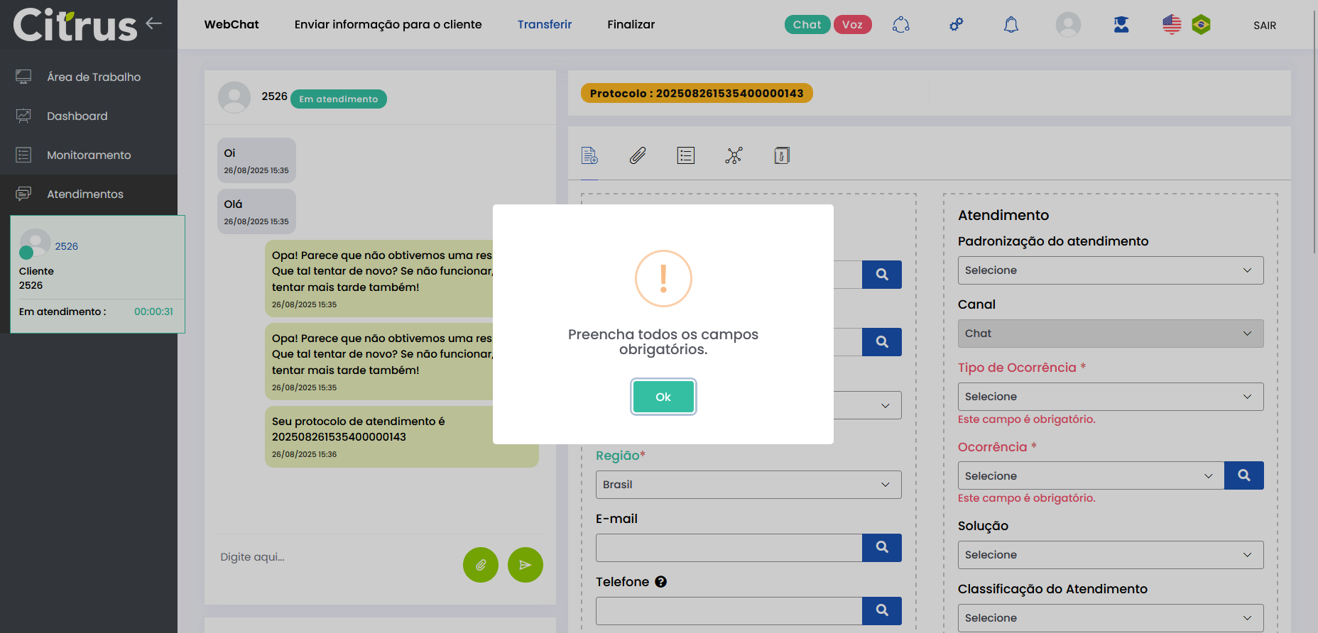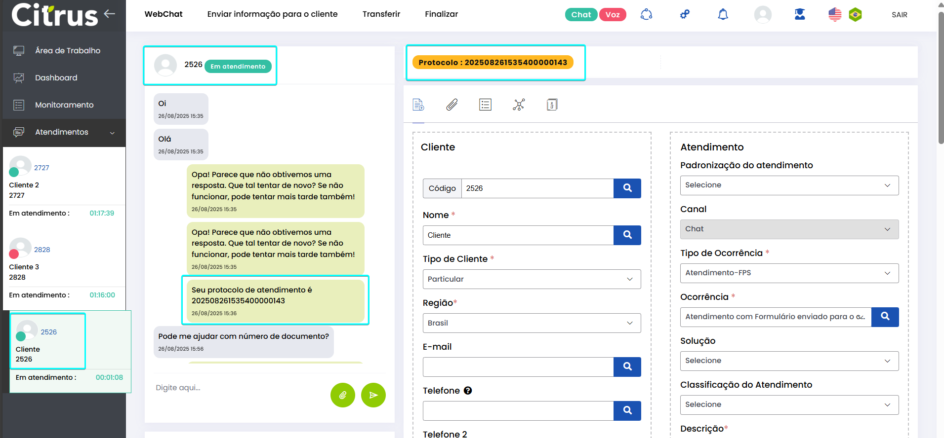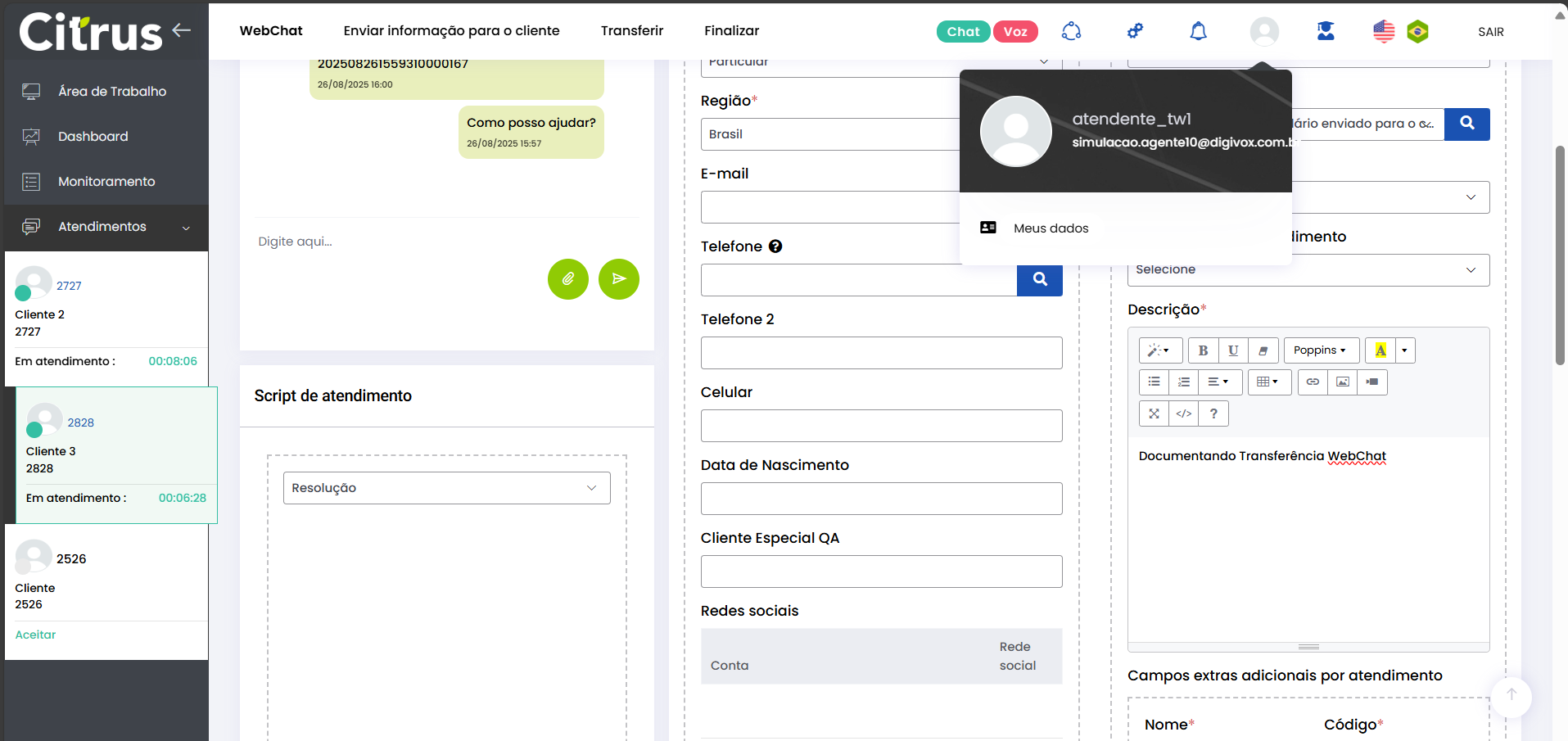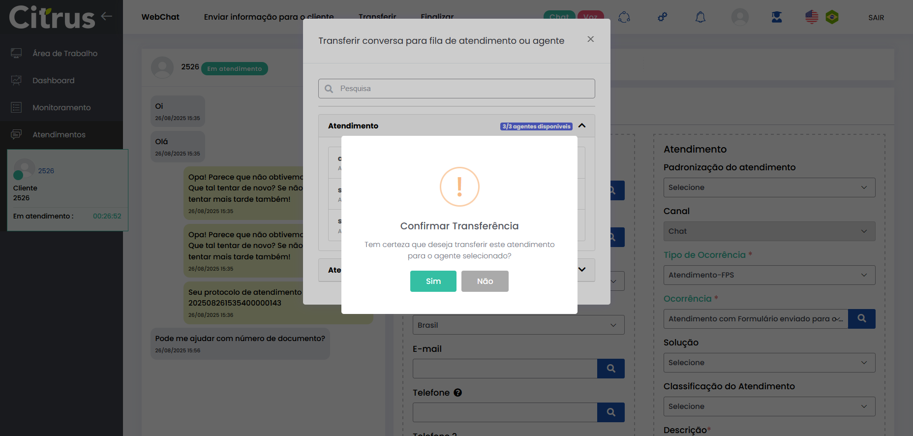 Transferir Atendimento WebChat Leitura estimada: 4 minutos 273visualizações O Atendente pode transferir atendimentos em andamento para outra fila ou outro Atendente do canal WebChat. A transferência permite que o cliente seja direcionado para o profissional ou setor mais adequado, sem perder o histórico da conversa. Além disso, o número do Protocolo é mantido após a transferência. O recurso proporciona fluidez aos atendimentos do canal e garante que todas as informações já fornecidas sejam preservadas. Benefícios O cliente não precisa repetir informações após a transferência. O novo Atendente tem acesso a todo o histórico da conversa. O atendimento segue com o mesmo número de Protocolo. Apenas Atendentes realmente disponíveis recebem a transferência. A experiência do cliente permanece fluida e transparente. Como a transferência funciona O atendimento permanece no canal: transferência só pode ser feita WebChat → WebChat. Campos obrigatórios do formulário de atendimento devem estar preenchidos antes da transferência. O atendimento transferido entra na fila de destino como prioridade 1, sendo o próximo a ser ofertado. O card é transferido respeitando o limite de atendimentos simultâneos por Atendente. Atendentes que atingiram o número máximo de atendimentos simultâneos estarão desabilitados para seleção no momento da transferência. Entre os Atendentes, a distribuição do atendimento respeitará a ordem da menor para a maior carga de atendimentos. Consulte Regras para Oferta de Cards de WhatsApp e WebChat Como transferir atendimento no canal WebChat Após preencher os campos obrigatórios do formulário do atendimento, clique no botão Transferir (topo do formulário). * Caso o Atendente não tenha preenchido todos os campos obrigatórios do formulário do atendimento, será alertado e não poderá seguir com a transferência. Se os dados obrigatórios foram adicionados ao formulário, ao pressionar Transferir o Atendente verá o pop-up de transferência na tela de Atendimentos. Ele pode aparecer de duas formas, contemplando os cenários possíveis sobre transferência: 1. Quando não existem filas disponíveis para receber transferência de atendimento 2. Quando existem filas disponíveis para receber transferência de atendimento Selecionar fila de atendimento ou Atendente: No pop-up de “Transferir conversa para fila de atendimento ou agente“, serão listadas as filas do canal WebChat. Ao lado de cada fila aparecem o total de Atendentes logados (na fila) e quantos desses encontram-se “disponíveis” para receber oferta de card de atendimento. Observe que existem duas filas, cada uma com 3 Atendentes logados e todos “disponíveis” para receber a transferência de atendimento. Ao clicar no seletor para ver mais informações de uma fila, será possível conferir quantos atendimentos “ativos” ou “em oferta” encontram-se com cada Atendente. Basta clicar no nome do Atendente para quem deseja transferir. Um novo pop-up solicitará confirmação da transferência para o Atendente selecionado. Pressione Sim, para confirmar. Ou, Não, pra cancelar. O card será ofertado para o Atendente selecionado como destinatário da transferência. Quando o Atendente Aceitar o card, visualizará: – O número de Protocolo original do atendimento. – Todas as informações inseridas no formulário pelo(s) Atendente(s) que já conversaram com o cliente. – Todo histórico de conversas (chat) com o cliente. O Atendente poderá prosseguir a conversa com o cliente e optar por realizar nova transferência ou Finalizar o atendimento. Acesse a Release notes da versão 2.109.37. Consulte também o Guia de Transferência de Atendimento no WhatsApp. Quer saber como os atendimentos são mostrados em tempo real para o Supervisor? Acesse o Guia de Monitoramento Citrus. × Clique nas imagens desta página para vê-las em tela cheia. Se preferir, recolha o menu da lateral esquerda da página para uma melhor visualização. Marcado:Agente Suporte WebChatAtendimento ao Cliente WebChatAtendimento Canal WebChatAtendimento Contact CenterAtendimento WebChatCall CenterCall Center OmnichannelCanal WebChatContact CenterContact Center CitrusContact Center com WhatsAppContact Center OmnichannelPlataforma Atendimento WebChatRecurso Transferir AtendimentoTransferência Atendimento ClienteTransferência de AtendimentoTransferência em Filas de WebChatTransferência entre Atendentes WebChatTransferir AtendimentoTransferir Atendimento Canal WebChatTransferir Atendimento de WebChatTransferir Atendimento do Canal WebChatTransferir Atendimento no Canal WebChatTransferir Atendimento WebChatTransferir AtendimentosTransferir Atendimentos de WebChatWebChat Atendimento Omnichannel