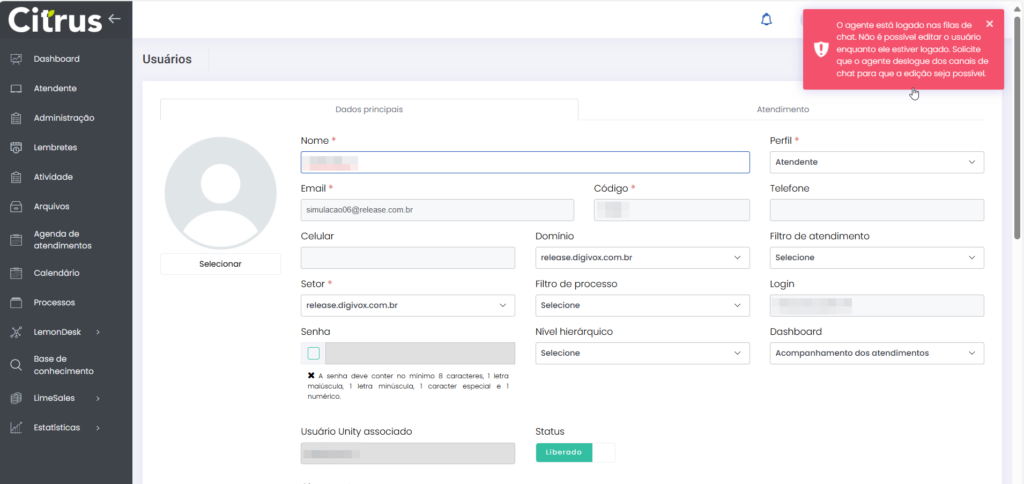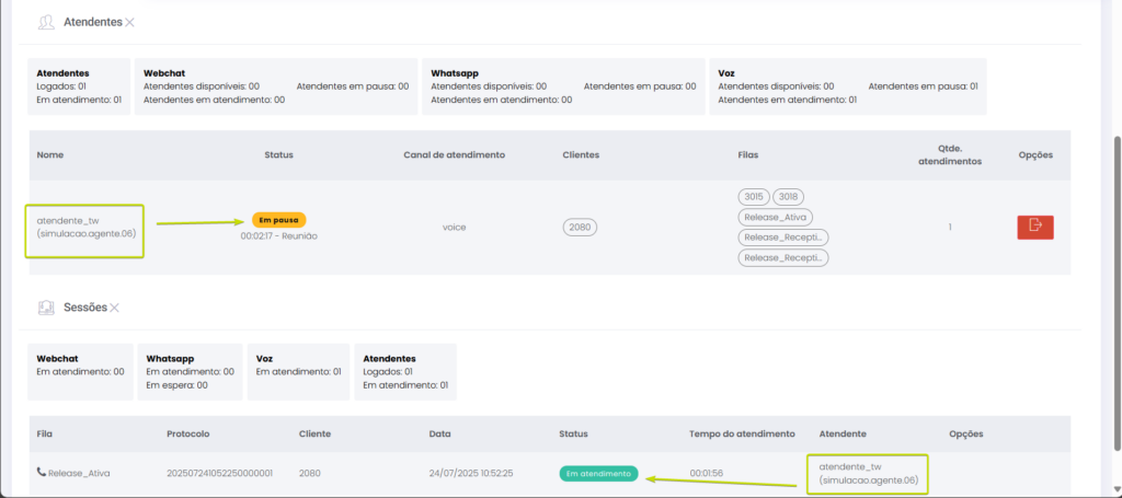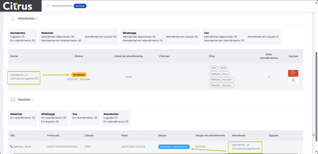 Versão 2.109.16 Leitura estimada: 3 minutos 145visualizações NOVIDADE Atendimentos: Atendente em Pausa poderá fazer chamada ativa Agora, o Atendente pode fazer chamada ativa mesmo estando em Pausa, sem que seu status de atendimento seja alterado. Enquanto estiver realizando a chamada ativa estando com status Pausa, a saída da Pausa será bloqueada. A liberação para sair da Pausa ocorrerá ao finalizar a chamada. Nas seções da tela de Monitoramento, o Supervisor visualizará as seguintes informações: Atendentes: A coluna “Status” mostrará que o Atendente está Em pausa. Sessões: Exibirá o Atendente em chamada com “Status” Em atendimento e, a seguir, Salvando o atendimento. Confira todos os detalhes no Guia de Monitoramento MELHORIA Administração: Bloqueada a edição de Atendentes logados em canais de chat A edição do cadastro de usuário de Atendentes não poderá ser feita enquanto ele estiver logado em filas de chat, como WebChat e WhastApp. Quando uma tentativa de edição for realizada pelo menu Administração > Usuários > Usuário > (editar cadastro de usuário), uma notificação será exibida para alertar que não é possível atualizar o cadastro sem antes solicitar que o Atendente faça logout das filas. Confira novas melhorias aplicadas na Release notes das versão 2.109.23. CORREÇÕES Atendimentos | Monitoramento: Resolvida falha de registro de chamada de voz Chamadas que tocarem em fila de voz quando nenhum Atendente estiver logado para atender serão devidamente registradas como não atendidas, assegurando a consistência dos dados exibidos para o Supervisor na tela de Monitoramento. Monitoramento: Ajustada a sincronia de status de Atendentes O status do Atendente na tela de Atendimentos está sendo corretamente atualizado na tela de Monitoramento, para que o Supervisor acompanhe a situação de Grupos de monitoramento. Marcado:AtendenteAtendente Em PausaAtendimentosCanaisCanais de AtendimentoCanais de ChatChamada AivaChamada AtivaChamada Ativa em PausaChamada Ava Em PausaChamada com Atendente em PausaEditar AtendentesEm PausaFazer Chamada com Atendente em PausaFila de VozGrupo de monitoramentoLogout do AtendenteMonitoramento Canais de AtendimentoMonitorar Canais de AtendimentoNotas de VersãoNotas de Versão CitrusPausaPausa do AtendenteRelease notesStatus de AtendimentosStatus do AtendenteSupervisorSupervisor Call CenterSupervisor Contact CenterSupervisor Grupo de Monitoramento de Call CenterTela de MonitoramentoVersão 2.109.16WebChatWebChat e WhatsAppWhatsApp