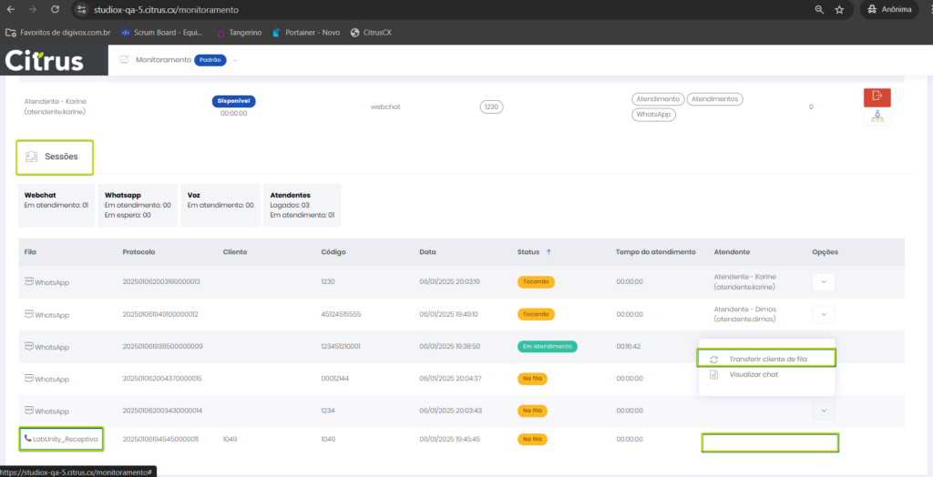 Versão 2.109.17 Leitura estimada: 2 minutos 110visualizações CORREÇÕES Monitoramento: Chamadas desligadas por clientes não permanecerão listadas na tela de Monitoramento Correção foi feita para evitar que, ao cliente desligar uma chamada porque estava ligando para uma fila sem Atendentes disponíveis (desistir do atendimento na fila de espera), essa ligação continue sendo exibida para o Supervisor na tela de Monitoramento. Monitoramento: Opção de “Transferir cliente de fila” não será exibida para o Canal de Voz Corrigida a falha em que a ação Transferir cliente de fila era apresentada para o canal de voz em Sessões da aba Detalhes (tela de Monitoramento). Agora, a opção é mostrada apenas para os canais de chat (WebChat e WhatsApp), respeitando o funcionamento esperado. Confira todas as ações disponíveis para o Supervisor no Guia de Monitoramento Marcado:Aba Detalhes do MonitoramentoAtendentesCanal WebChatCanal WhatsAppChamadas desligadasClienteCliente Desliga ChamadaCliente Na FilaDesistência na FilaDetalhes do MonitoramentoFila de atendimentoFila de EsperaFila sem Atendentes DisponíveisGuia de MonitoramentoMonitoramentoMonitoramento Aba DetalhesMonitoramento de Call CenterMonitoramento de Contact CenterNotas de VersãoRelease notesSessõesSupervisorSupervisor de Contact CenterTransferir cliente de filaVersão 2.109.17