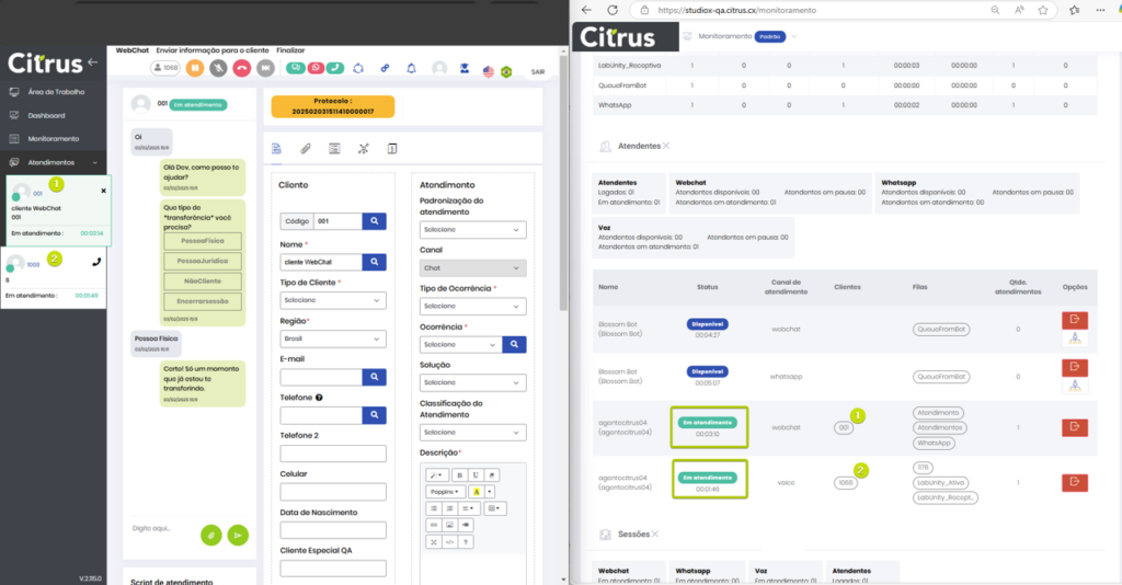 Versão 2.109.18 Leitura estimada: 2 minutos 105visualizações CORREÇÕES Monitoramento: Contador de tempo exibirá o atendimento em que o Atendente se encontra há mais tempo, para cada canal O contador de tempo de atendimentos da seção Atendentes (tela de Monitoramento > (aba) Detalhes) exibirá, para cada canal em que um Atendente está “Em atendimento”, o tempo do card que apresenta maior duração. O padrão evita que sejam exibidos tempos iguais para atendimentos de canais diferentes, permitindo que o Supervisor tenha uma visão real do tempo dedicado a cada atendimento. No exemplo é possível comparar em tempo real os atendimentos de um Atendente, na tela de Atendimentos, e as informações apresentadas para o Supervisor na tela de Monitoramento . Monitoramento: Atendimentos abandonados por Atendentes passam a ser contabilizados na aba Resumo Quando um Atendente receber um card ofertado a ele na tela de Atendimentos e abandonar esse atendimento, por exemplo, fazendo logout da fila, esse atendimento será considerado nas “Estatísticas resumidas das filas”, na contagem de Atendidas. Assim, não devem ocorrer divergências entre os dados exibidos para o Supervisor na aba Resumo > (seção) Estatísticas resumidas das filas e os registrados em Banco de Dados. Consulte o Guia de Monitoramento Citrus Marcado:Aba Detalhes do MonitoramentoAba Detalhes MonitoramentoAba Resumo do MonitoramentoAtendentesEm AtendimentoGuia de MonitoramentoMonitoramentoMonitoramento Call CenterMonitorar AtendimentosMonitorar Atendimentos de Call CenterNotas de VersãoNotas de Versão CitrusRelease notesStatus de AtendimentosStatus Em atendimento no MonitoramentoSupervisorTela de MonitoramentoTela de Monitoramento CitrusTempo do atendimentoVersão 2.109.18