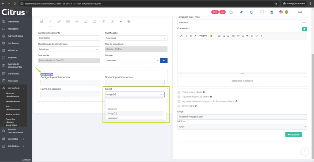 Versão 2.109.21 Leitura estimada: 3 minutos 119visualizações MELHORIA Atendimentos | Monitoramento: Saída de Pausa está sendo executada normalmente Se um card de atendimento de filas do canal de Voz for recusado (tela de Atendimentos) e o Atendente entrar automaticamente em Pausa, o motivo da pausa será exibido na listagem de filas. Nessa situação, o Atendente poderá executar normalmente a ação para sair da Pausa. Além disso, o motivo da pausa aparecerá na tela de Monitoramento para o Supervisor como “Pausa de sistema”. Foram feitos ajustes na sincronia de status de Atendentes para resolver os seguintes cenários: Atendente não conseguia sair da Pausa automática. O motivo da pausa não era mostrado na listagem de filas do canal de Voz (tela de Atendimentos). Consulte o Guia de Monitoramento da plataforma Citrus. CORREÇÕES Atendimentos: Ajustada a nomenclatura de opções em campos que permitem seleção de valores contidos em grupo de campos extras Quando um Atendente estiver preenchendo um formulário de atendimento de canal que possua grupo de campos extras, em LemonDesk > Atendimentos, clicar em um campo que permite selecionar diferentes valores, visualizará as opções disponíveis de forma íntegra. Foi resolvido o cenário em que os nomes das opções apareciam preenchidos com os valores (dados de preenchimento) correspondentes a eles. A correção feita deve assegurar que durante o cadastro de opções para campos do tipo multivalores sejam aceitos caracteres alfanuméricos, como acentos, espaços e parênteses “()”, tanto no nome do campo como no valor informado. Atendimentos: Informações estão sendo corretamente registradas em formulários de atendimentos com solução em etapas Quando a tela de um formulário de atendimento que contém solução em etapas for recarregada (LemonDesk > Atendimentos), todas as informações de etapas já preenchidas serão apresentadas devidamente registradas. Foi resolvido o cenário em que, ao completar os dados de uma etapa e pressionar Salvar e continuar (no topo da tela), as informações não apareciam após a tela ser atualizada. Atendimentos: Resolvida falha no salvamento de campos derivados de outros campos em formulário de atendimento com etapas Quando campos derivarem de outros campos dentro das etapas de solução de um formulário de atendimento, como demonstrado na imagem, o salvamento das informações desses “subcampos” vai gerar o registro dos dados da forma devida. O cenário em que as informações preenchidas não apareciam após o Atendente clicar em Salvar e continuar e a tela com o formulário de atendimento (LemonDesk > Atendimentos > atendimento com solução em etapas) ser recarregada foi resolvido. Marcado:AtendenteAtendimento com Solução em EtapasAtendimentosCampos extrasCaracteresCaracteres AlfanuméricosCards de AtendimentoFila de VozFilas do Canal de VozFormulário de AtendimentoLemonDeskMotivo de pausaPausa Automática de SistemaPausa de sistemaPausa do AtendenteRelease notesSair de PausaSeletor de valoresSolução em etapasStatus do AtendenteTela de MonitoramentoTela do AtendenteVersão 2.109.21