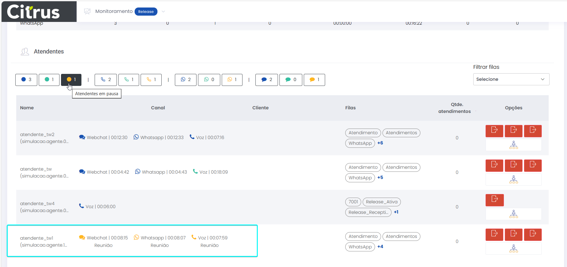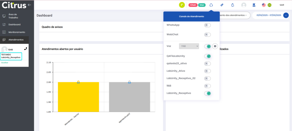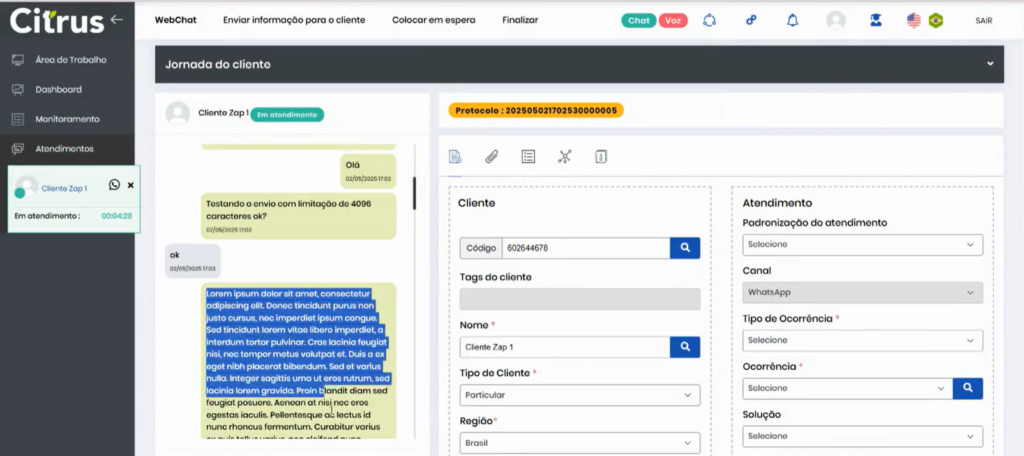 Versão 2.109.31 Leitura estimada: 7 minutos 129visualizações NOVIDADE Atendimentos: Card de voz exibirá opção de URA e nome da fila de atendimento Os cards de chamadas recebidas por filas do canal de voz, que possuem configuração de URA (Unidade de Resposta Audível), exibirão a opção selecionada na URA e a identificação da fila enquanto estiverem tocando na tela de Atendimentos (LemonDesk > Atendimentos). A partir da implementação, o Atendente conseguirá visualizar a origem e o caminho percorrido por uma ligação antes de aceitá-la. As informações fornecem contexto para que o Atendente possa definir a melhor forma de conduzir o atendimento. * Os dados não serão apresentados para cards de filas de voz que não tenham configuração de URA. Confira mais informações sobre o funcionamento de URA MELHORIAS Atendimentos: WhatsApp permitirá mensagens com até 4.096 caracteres de texto O limite de caracteres permitidos no chat e no campo “Comentário” do formulário de atendimento do canal WhatsApp foi ampliado. Agora, pode ser utilizada a quantidade de caracteres padrão determinada pela Meta, que é de 4.096. A melhoria deve facilitar a comunicação entre Atendentes e clientes, especialmente em atendimentos mais complexos que exigem maior detalhamento. Clique nas imagens para vê-las em tela cheia. Acesse o Guia de Atendimento do Canal WhatsApp Monitoramento: Atualização de dados do monitoramento será pausada enquanto Supervisor estiver filtrando filas A atualização da aba Detalhes do Monitoramento (Estatísticas > Monitoramento > (aba) Detalhes) será pausada temporariamente enquanto o Supervisor estiver utilizando o seletor de Filtrar Filas da seção Atendentes. Assim que fechar o seletor a atualização automática será retomada. A melhoria deve permitir que o Supervisor consiga utilizar o filtro sem ser interrompido pela atualização automática da tela. Filtro de filas. Consulte o Guia de Monitoramento CORREÇÕES Administração: Normalizada a edição de Soluções globais A atualização de campos de Soluções globais cadastradas pelo menu Administração > Configurações Gerais > Soluções globais está funcionando como esperado. A edição e salvamento funcionarão corretamente quando: Editados apenas campos, mas não o nome da solução. Alterado o nome, desde que não seja igual a outro já em uso. Atendimentos: Card de atendimento redirecionado para outra fila ou Atendente manterá informações da chamada Quando uma fila de atendimento do canal de voz possuir configuração de pesquisa de satisfação e de “transbordo” (redirecionamento automático da chamada para outra fila ou Atendente quando a capacidade máxima de atendimento da fila ou o tempo limite de espera for atingido), o Atendente da fila para a qual a chamada for encaminhada visualizará o card com todas as informações do cliente. O cenário em que o card aparecia em branco após encaminhamento para outra fila foi resolvido. Atendimentos | Monitoramento: Resolvidas inconsistências em transferência de chamada e exibição de “Sessões” no Monitoramento Estão resolvidos os seguintes cenários envolvendo transferência de chamada (canal de voz) na tela de Atendimentos (LemonDesk > Atendimentos) e atualização de status de atendimentos na tela de Monitoramento (Monitoramento > (aba) Detalhes > Sessões): Atendimentos → Atendente não conseguirá transferir chamada sem estar com o card do atendimento selecionado e preencher campos obrigatórios do formulário de atendimento (assista ao vídeo). → Caso o Atendente destinatário da chamada não aceite a ligação, o Atendente que estava tentando transferir poderá finalizar o atendimento, sem que ocorra travamento da interface. Monitoramento: Quando uma chamada for transferida o fluxo de atendimento será corretamente atualizado, mostrando em Sessões qual Atendente está com a ligação e qual o status do atendimento. Na demonstração é possível observar que ao tentar transferir a chamada o Atendente é alertado de que deve, primeiro, preencher campos obrigatórios do formulário de atendimento. Confira na galeria a seguir a atualização de status apresentada na tela de Monitoramento quando uma chamada é transferida. Em transferência: Observe que os dois Atendentes aparecem com status “Disponível”, pois o que fez a transferência não está mais com a chamada “Em atendimento” e o destinatário ainda não atendeu. Aqui o Atendente destinatário da transferência aceitou a chamada e está “Em atendimento”. Por fim, o Atendente destinatário da transferência encerrou a chamada e está salvando informações do formulário de atendimento. Clique nas imagens para vê-las em tela cheia. Monitoramento: Filtro “Atendentes em pausa“ exibirá a quantidade correta de operadores que apresentam o status Ao monitorar atendimentos pela seção Atendentes da aba Detalhes (Estatísticas > Monitoramento > (aba) Detalhes), o Supervisor visualizará a quantidade correta de operadores ao pressionar o filtro Atendentes em pausa. O cenário em que estavam sendo contabilizados todos os canais com Atendente em pausa ao invés do número total de operadores com esse status foi resolvido. Processos: Apenas fluxos ativos serão listados ao abrir novo processo do tipo “Interno” no Citrus A consulta responsável por listar os fluxos disponíveis durante a criação de Processos do tipo “Interno” foi ajustada para exibir apenas registros ativos. A partir do ajuste, fluxos desativados não aparecerão mais como opções para seleção, eliminando a possibilidade de uso indevido de fluxos inativos. Marcado:Aba DetalhesAdministraçãoAtendenteAtendentes em PausaAtendimentosAtualização de dados pausadaCanal de VozCaracteresCards de VozClienteConfiguração de URAConfigurações GeraisEstatísticasEstatísticas MonitoramentoFila de VozFluxo de ProcessosGuia de MonitoramentoLemonDeskMetaMonitoramentoProcesso Interno A